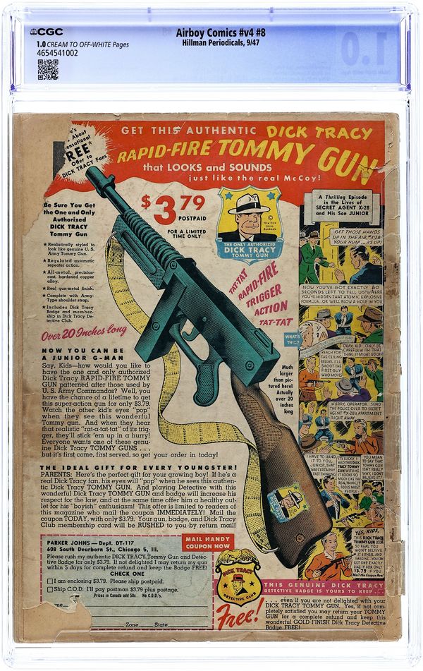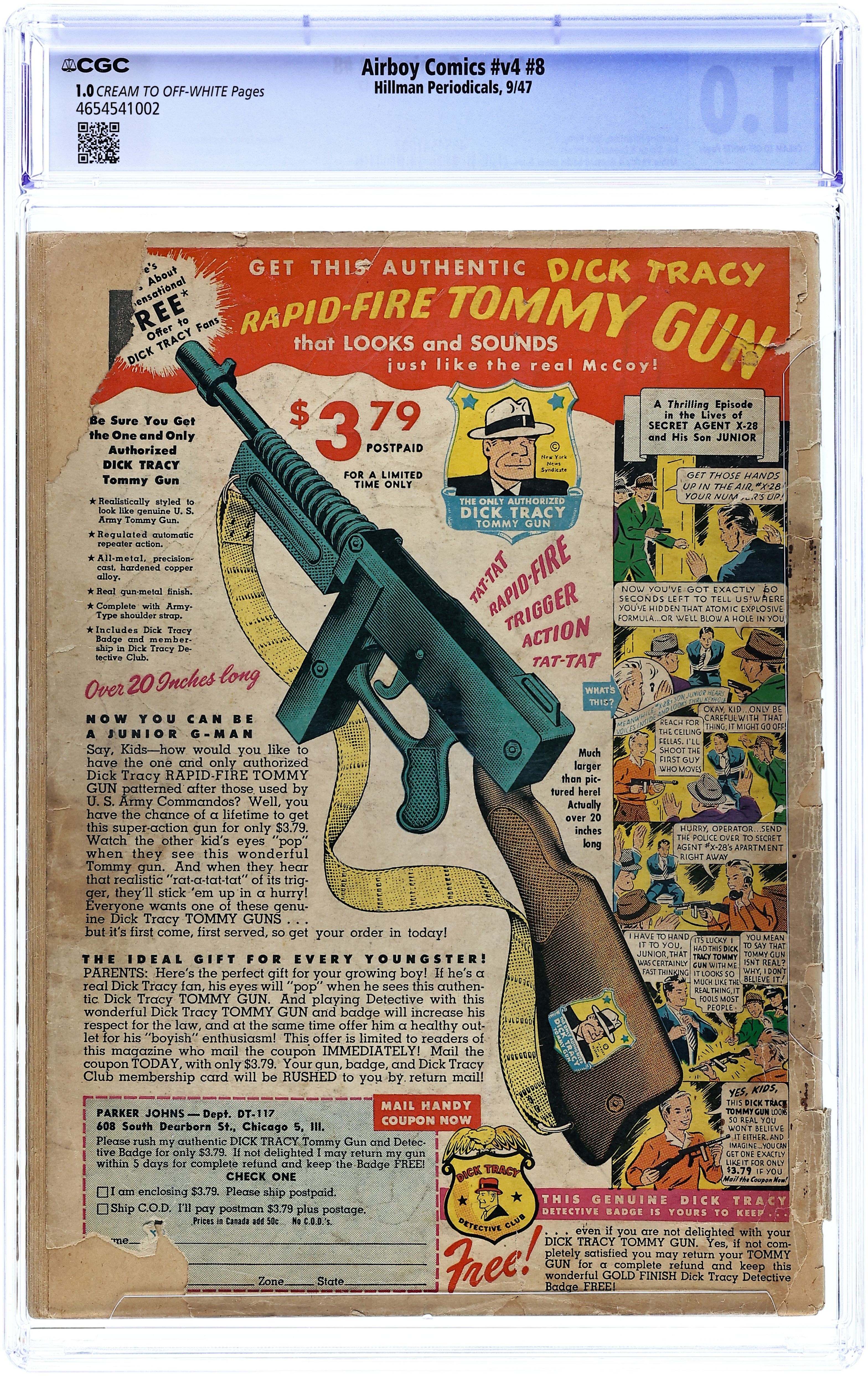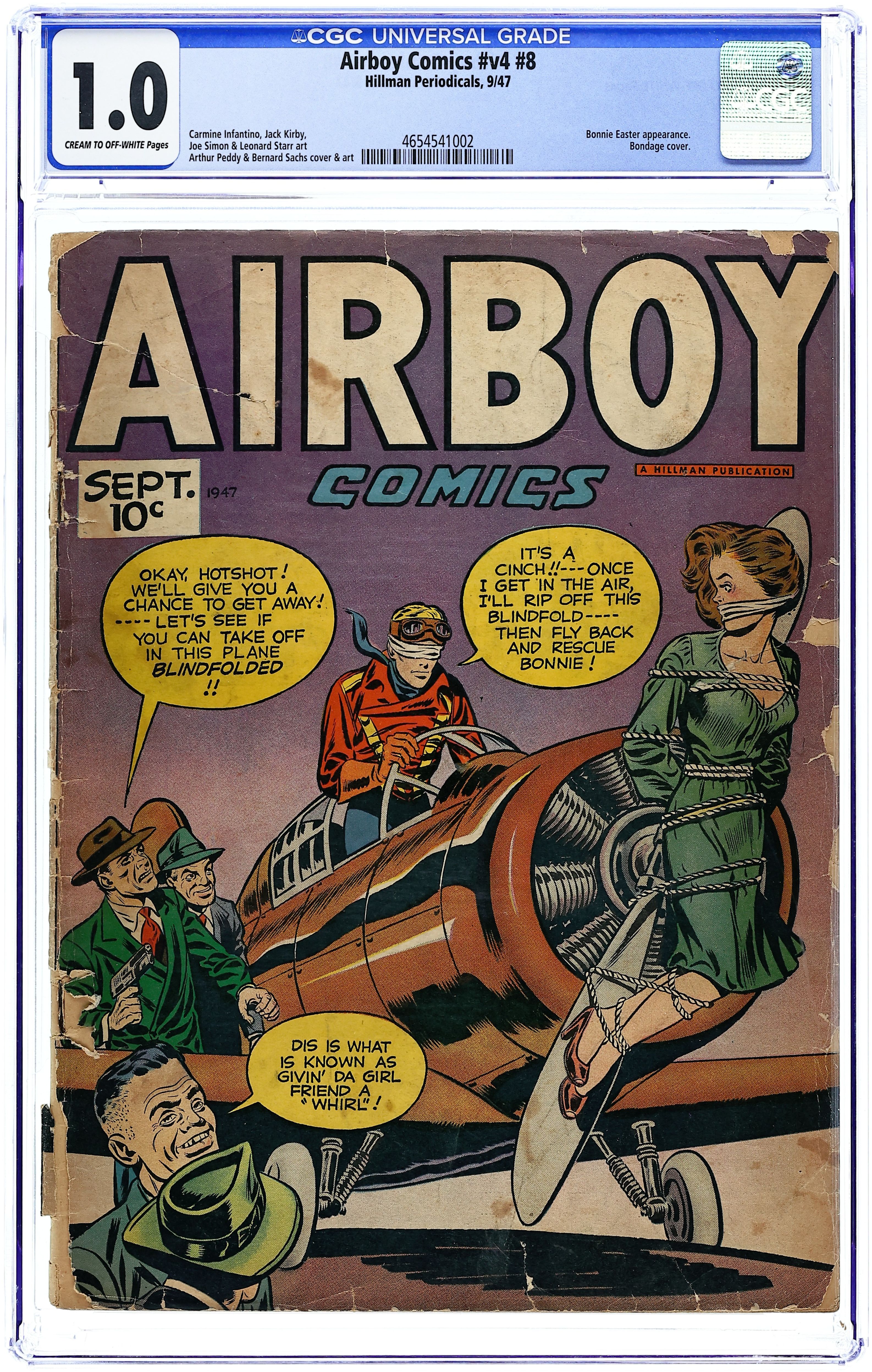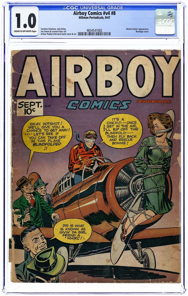 Cover by Arthur Peddy and Bernard Sachs. Stories and art by Arthur Peddy, Bernard Sachs, C. W. Winter, Carmine Infantino, Joe Simon and Jack Kirby. One of the more fanciful and influential of 1940s aviator heroes, Airboy fights evil with his radio-controlled plane "Birdie" and its plethora of experimental flying tech. Sometimes listed as Airboy Comics #43. No issue # on cover; Vol. 4, issue #8 in indicia. Airboy gives chase when action-girl Bonnie Easter returns and is promptly kidnapped. A small-time hood who owes money to the mob decides to capture The Heap for the reward. Flying Fool battles Mordecai Grumm, who believes flying planes are unnatural and blasphemous, in a story with art by Captain America creators Jack Kirby and Joe Simon. Propeller bondage elements on the cover (or as one bad guy puts it, "givin' da girl friend a whirl.") Airboy; The Heap; Model Builders With Airboy; Buckbite Brothers; Rackman; Flying Fool: His Brother's Keeper; Inside Man. 52 pages, Full Color. Cover price $0.10.