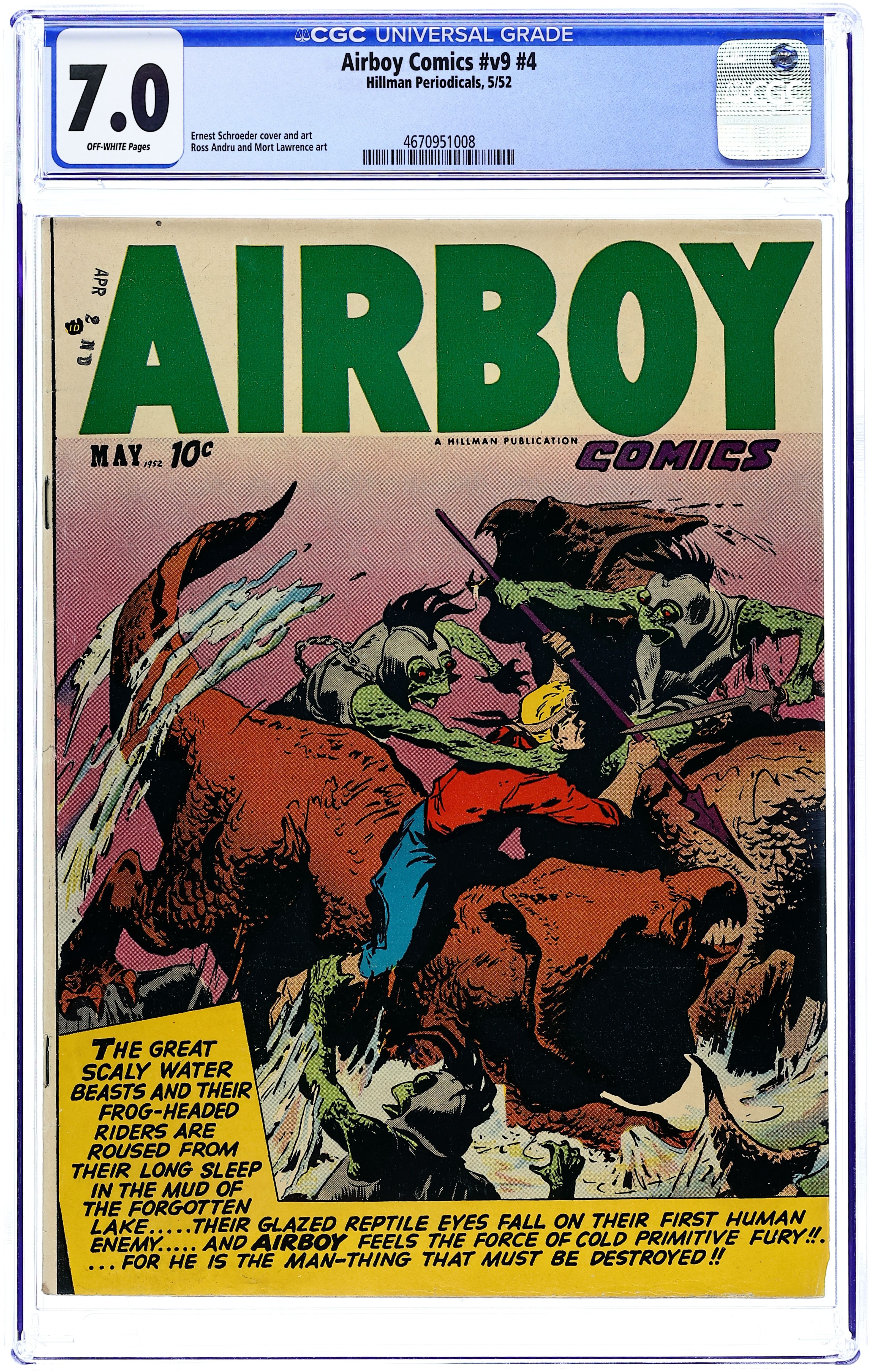 Cover by Ernest Schroeder. Stories and art by Mort Lawrence, Ross Andru and Ernest Schroeder. One of the more fanciful and influential of 1940s aviator heroes, Airboy fights evil with his radio-controlled plane "Birdie" and its plethora of experimental flying tech. Sometimes listed as Airboy Comics #99. No issue # on cover; Vol. 9, issue #4 in indicia. Airboy battles froglike humanoids that live in a city at the bottom of a lake. The Heap encounters a supervillain called the Black Panther (years before the Marvel hero) - a man obsessed with ancient Rome and its violent, tyrannical rituals. Foreign hunters in Tibet are warned not to pursue the mysterious beast called Sher-ka. Airboy; The Heap; Science Wins Again; Bay of the Tresses; The Glass Mask; Camp Fires; The Black Prize. 32 pages, Full Color. Cover price $0.10.