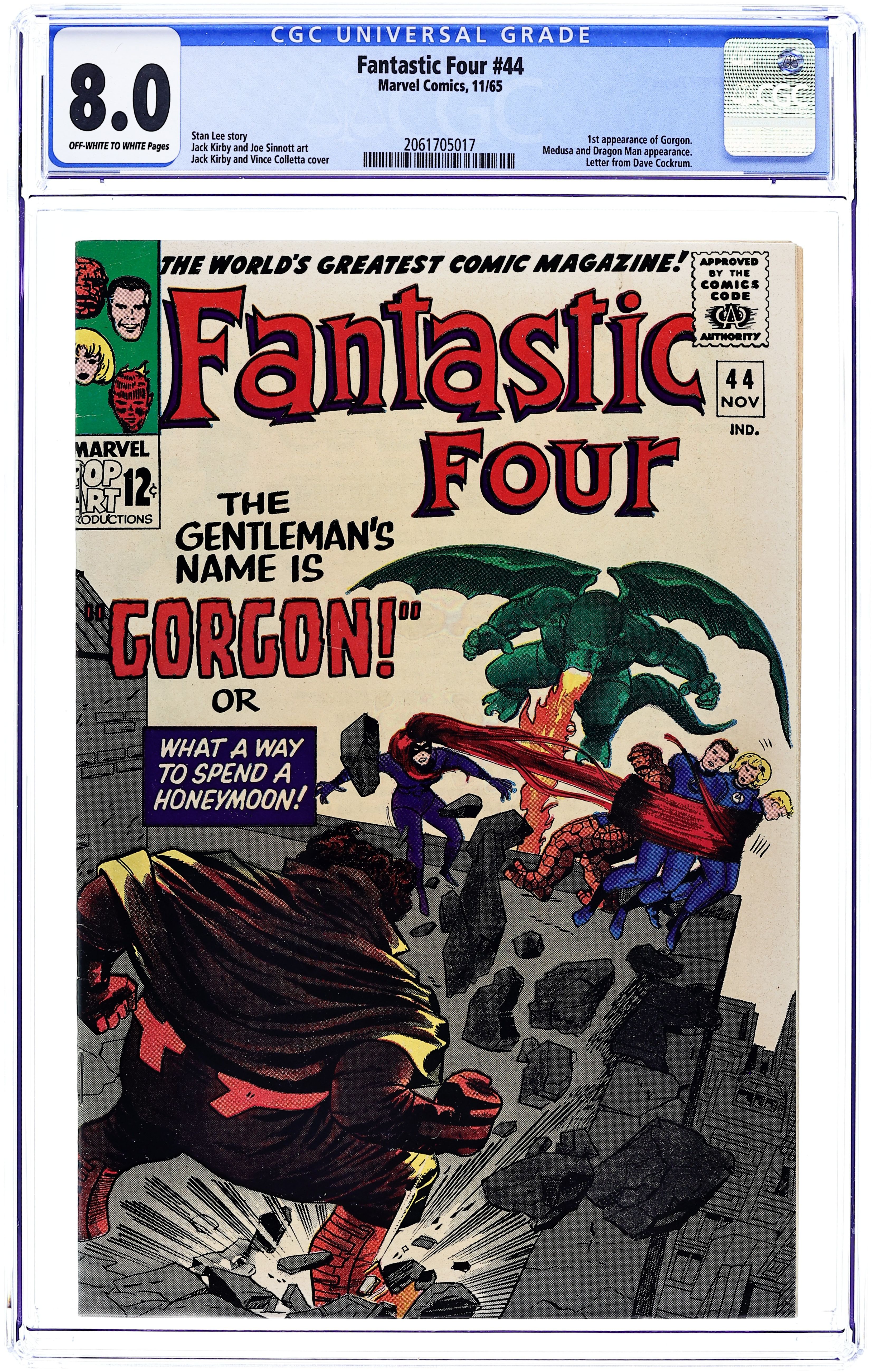 Ends Jan 26 8:10 PM CST Bid History 6 bids Current Bid $57 Your Secret Max Bid If you'd like to bid, please log in or register. Cover pencils by Jack Kirby, inks by Vince Colletta. The Gentleman's Name Is Gorgon! or What a Way to Spend a Honeymoon!, script by Stan Lee, pencils by Jack Kirby, inks by Joe Sinnott; Medusa seeks the FF's help in eluding Gorgon. Dragon Man appearance. Letter to the editor from Dave Cockrum. 36 pgs. $0.12. Cover price $0.12.