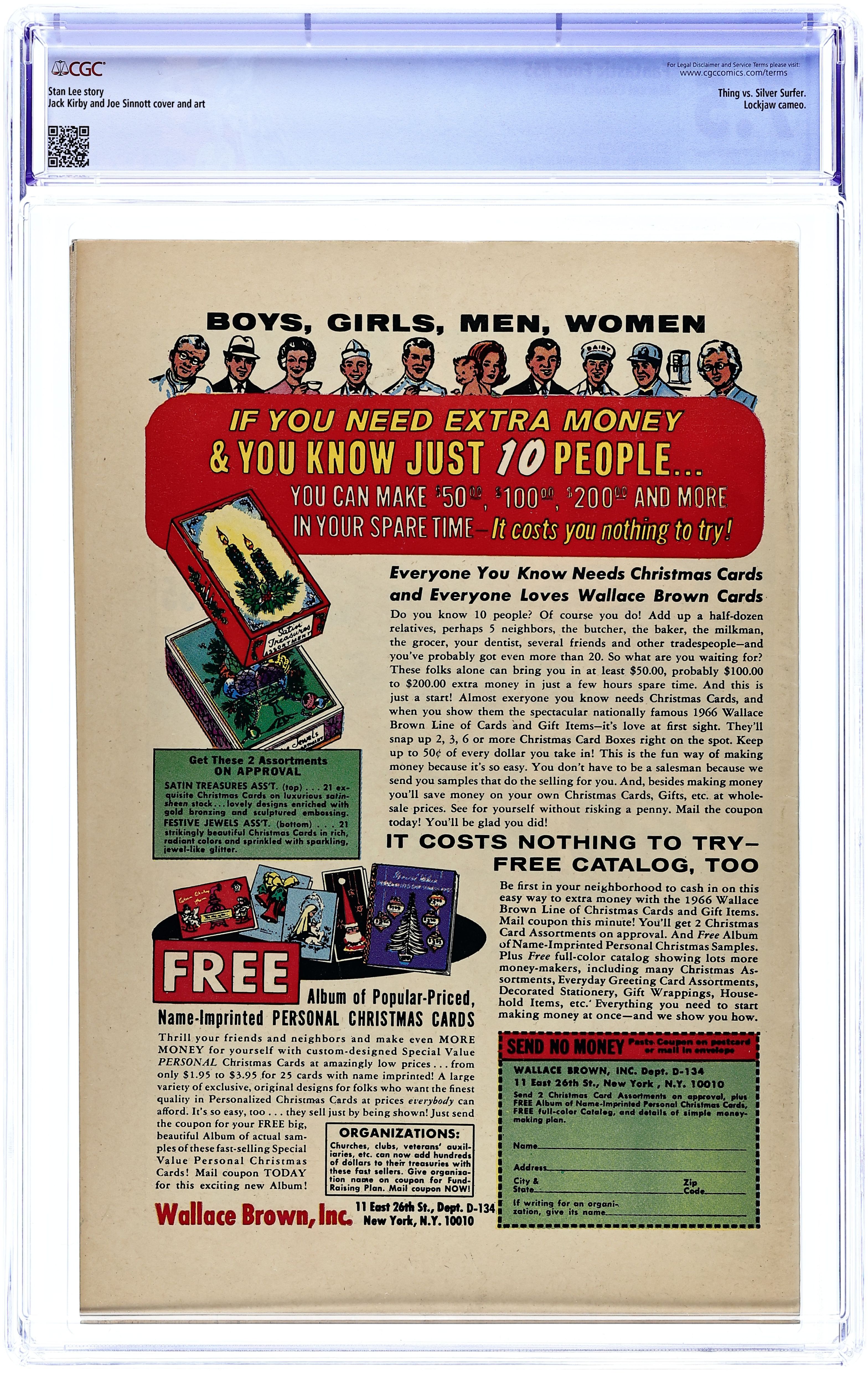 Cover pencils by Jack Kirby, inks by Joe Sinnott. Fourth appearance of the Silver Surfer in "When Strikes the Silver Surfer!", script by Stan Lee, pencils by Jack Kirby, inks by Joe Sinnott; Filled with jealousy, Ben attacks the Silver Surfer. Lockjaw (of the Inhumans) appearance. 36 pgs. $0.12. Cover price $0.12.