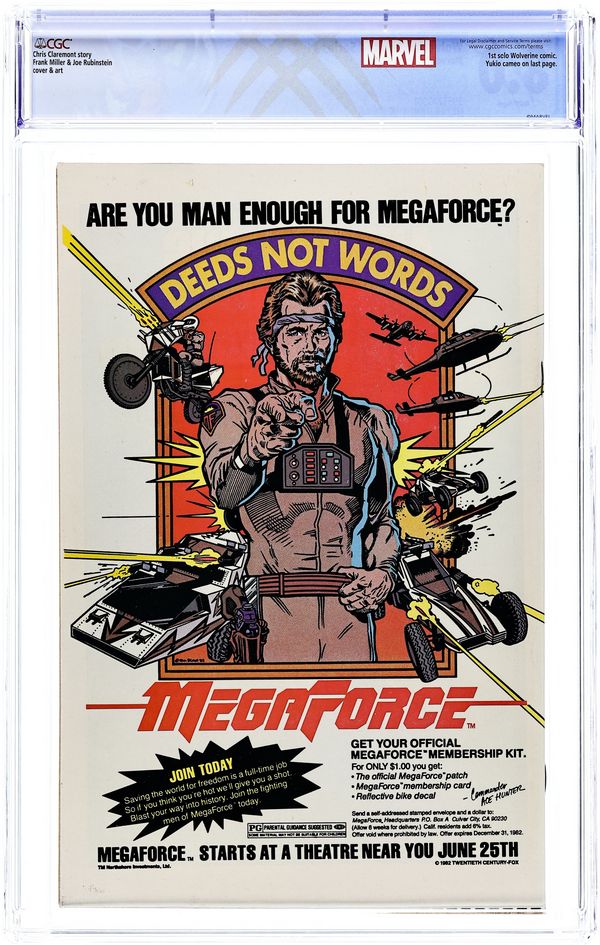 Newsstand Edition. 1 of 4 Featuring Wolverine in his first solo series fighting in Japan. "Wolverine." Script by Chris Claremont, pencils by Frank Miller, inks by Joe Rubinstein. Miller/Rubinstein cover. Back cover MegaForce ad with art by William Stout. Cover price $0.60.