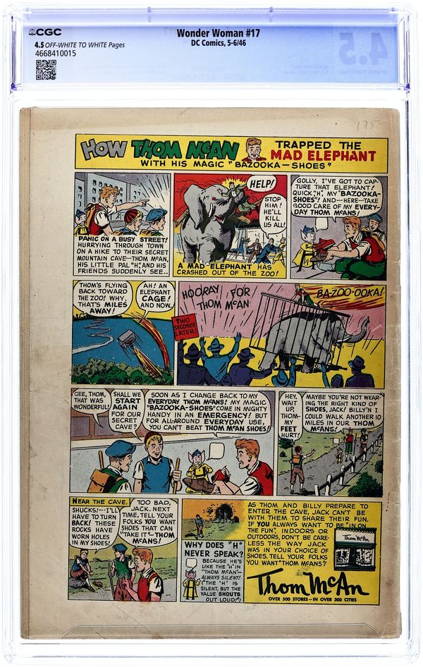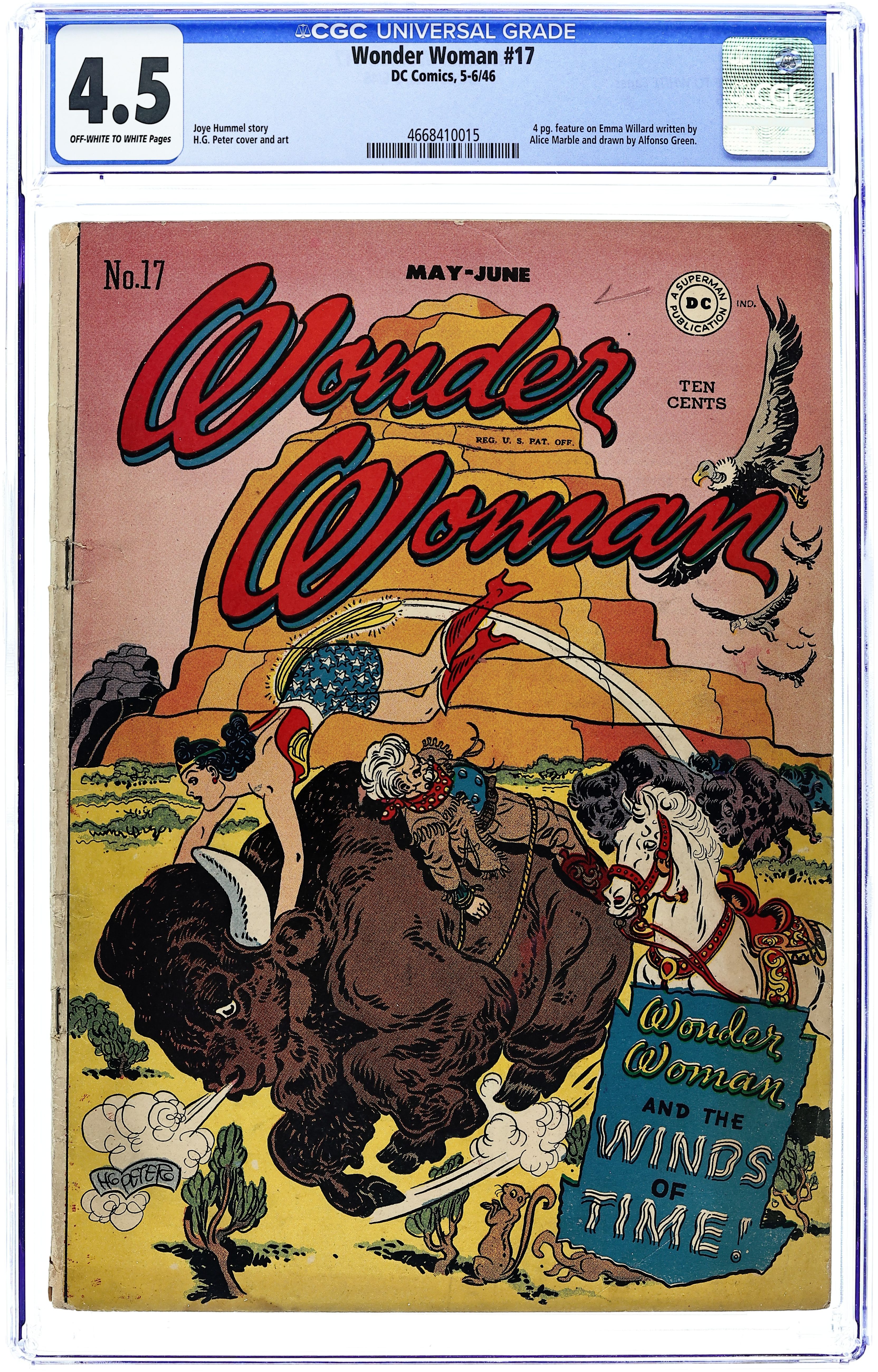 Cover by Harry G. Peter. "The Winds of Time" (Part 1), script by Joye Hummel (as Charles Moulton), art by Harry G. Peter; After their friend Dr. Kurree invents a cure for cancer, but an unauthorized use kills a man, Wonder Woman and Steve time travel to ancient Rome to help the brilliant but confused scientist swept to the past by the Winds of Time, where she confronts her deceptive boyfriend in a previous lifetime. Wonder Women of History: four-page Emma Willard bio, script by Alice Marble, art by Alfonso Greene. "The Redskins' Revenge" (The Winds of Time Part 2), script by Joye Hummel (as Charles Moulton), art by Harry G. Peter; Wonder Woman and Steve follow Lana and the Holliday Girls to the Old West where they expose Silas Sneek, who has been cheating the Native Americans in their trading with Daniel Beene. "The Winds of Time Part 3: Subterranean Death," script by Joye Hummel, pencils by Harry G. Peter, inks by Harry G. Peter and Arlene (backgrounds); Carl forces Lana to sign over the rights to her cancer cure by secretly framing her for a murder and capturing Wonder Woman and the Holliday girls in a death trap. Two-page text story, "Battle of the Deep" by Jim Robinson. Two-page Tippie strip, "That's Right!" by Edwina Dumm. One-page Tootsie Roll ad, "Captain Tootsie and the Return of Dr. Nasty" (by C.C. Beck and Pete Costanza). 52 Pages, Full Color. Cover price $0.10.