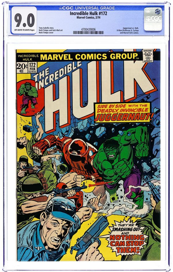 Cover art by Herb Trimpe. And Canst Thou Slay... the Juggernaut?, script by Steve Englehart (plot) and Tony Isabella (script), pencils by Herb Trimpe, inks by Jack Abel; Hulk has been captured and put in a holding cell at Hulkbuster base; As he is quickly dismantling the walls of his prison, Armbruster calls on Peter Corbeau who brings a ray to teleport the Hulk to another dimension; Hulk is blasted away but the Hulkbusters find themselves facing the Juggernaut in his place; When they try to use the ray again, the Hulk returns as well and the two powerhouses quickly bust out and get away; Hulk quickly finds he does not like his new ally and the two battle; The X-Men show up to capture Juggernaut but allow the Hulk to escape. Appearances by the X-Men (Professor X, Cyclops, and Marvel Girl in a crossover with Avengers 111), plus cameos by Doctor Strange, the Angel, the Beast, and Iceman. 36 pgs. $0.20. Cover price $0.20.