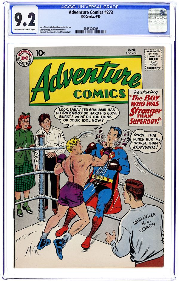 Cover pencils by Curt Swan, inks by Stan Kaye. Prisoner of the Super-Heroes, script by Jerry Siegel, art by George Papp; The Legion returns to 20th Century to discredit Superboy and exile him from Earth. The Manhunt On Land!, script by Robert Bernstein, art by Ramona Fradon; The Shark and The Wizard escape from jail; The Shark decides to operate on land but Aquaman captures him anyway. The Underwater Archers! starring Green Arrow, script by Robert Bernstein, art by Lee Elias; this is part two of the Aquaman story. 36 pages, Full Color. NOTE: 2nd appearance of Legion of Super-Heroes. Cover price $0.10.