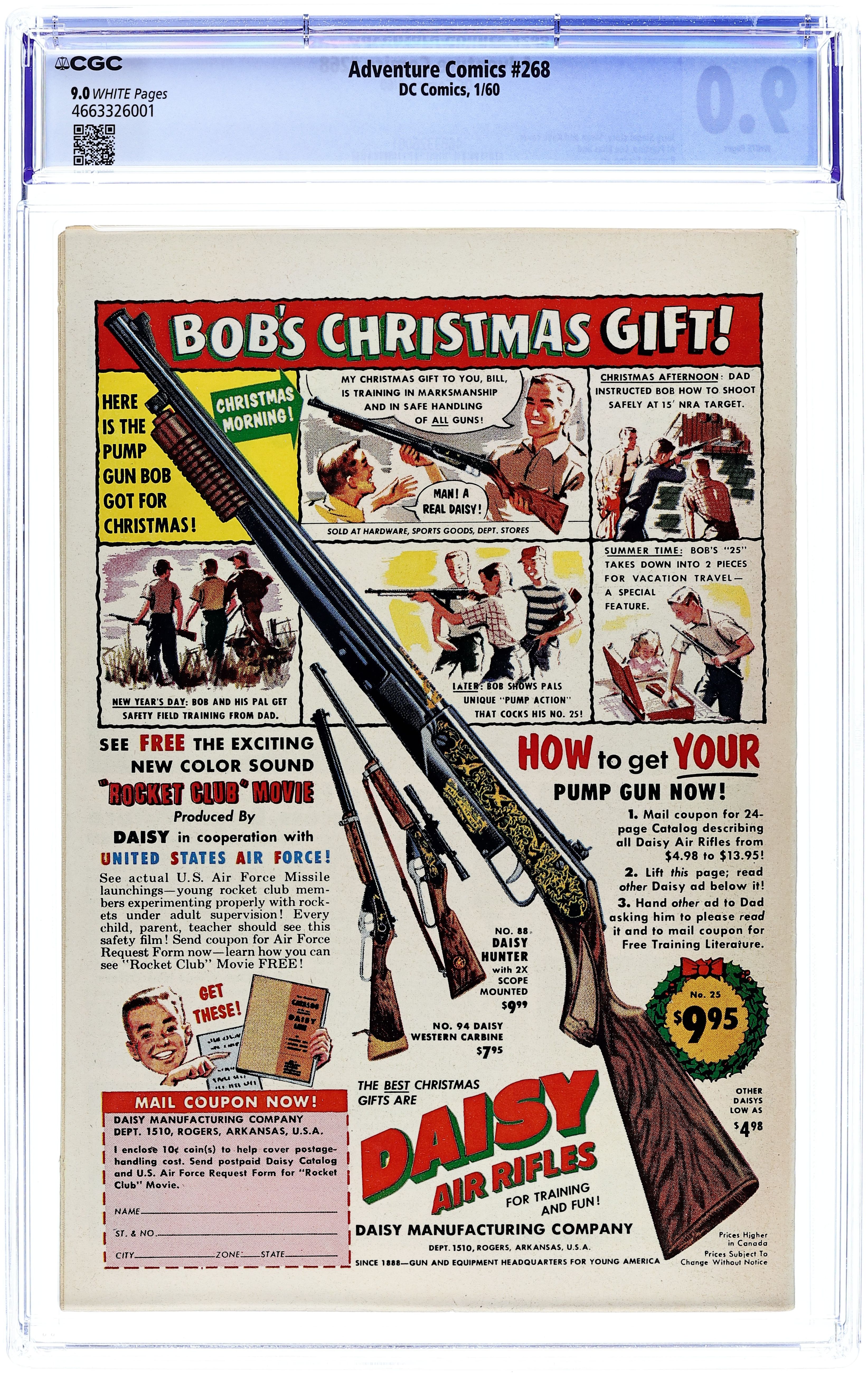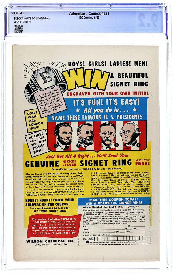 Cover art by Win Mortimer. Work Can Be Fun public service announcement starring Buzzy, script by Jack Schiff, art by Win Mortimer. The Super Brat of Smallville, script by Otto Binder, art by John Sikela; Bradley Ashton causes trouble for Superboy. The Lagoon of Doom starring Aquaman, art by Ramona Fradon. Jimmy Olsen #1 ad, pencils by Curt Swan, inks by Stan Kaye. Supergram the Superman Puzzle Game. Johnny Quick, King of Comedy, art by Ralph Mayo. Varsity Vic humor page by Henry Boltinoff. The Amazing Arrowthon starring Green Arrow, art by George Papp. 44 pages, Full Color. Cover price $0.10.
