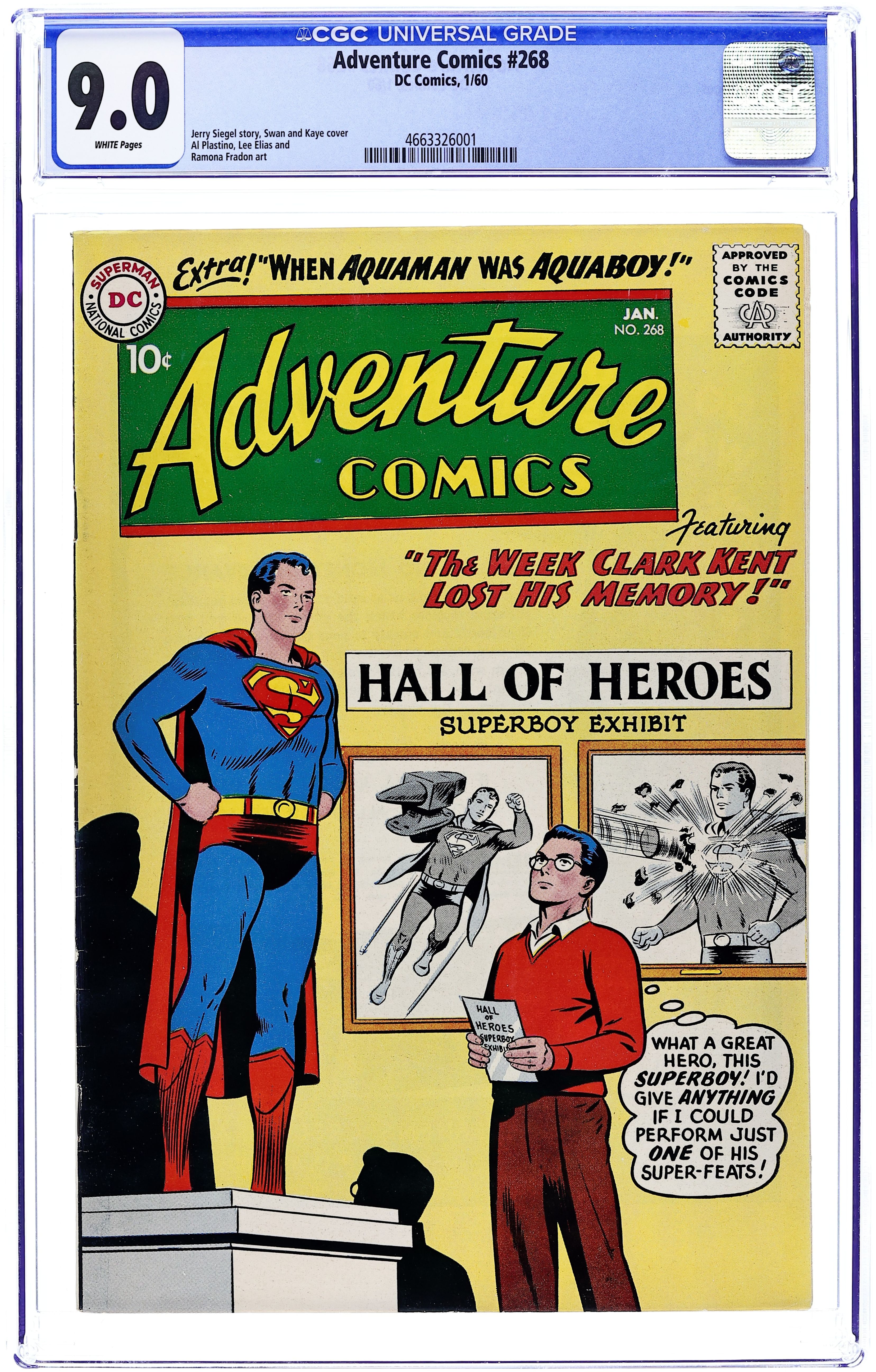 Cover pencils by Curt Swan, inks by Stan Kaye. The Week That Clark Kent Lost His Memory!, script by Otto Binder, art by Al Plastino; Red Kryptonite causes Superboy to lose his memory and leaves him stranded far from home. Green Arrow In King Arthur's Court!, art by Lee Elias; Green Arrow and Speedy both dream that they are back in the time of King Arthur; Or was it more than a dream? The Adventures of Aquaboy! starring Aquaman, script by Robert Bernstein, art by Ramona Fradon. 36 pages, Full Color. Cover price $0.10.