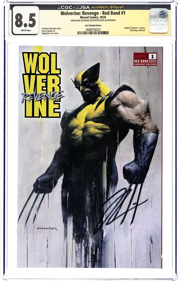 Comics Illuminati (Unknown Comic Books, Comic Traders, and Sleeping Giant) Exclusive Variant Cover by Puppeteer Lee. NOTE: Will be unbagged for grading. Written by Jonathan Hickman. Art by Greg Capullo. An even bloodier cut of WOLVERINE: REVENGE #1, with exclusive pages and elevated violence you won't see anywhere else! Polybagged for the protection of innocent eyes! HICKMAN AND CAPULLO JOIN FORCES FOR A WOLVERINE EPIC LIKE NO OTHER! Greg Capullo makes his grand return to Marvel Comics storytelling as he and Jonathan Hickman pit WOLVERINE against a cadre of foes who will turn his world upside down! He's been beaten! He's been bloodied! And LOGAN only has one thought on his mind: REVENGE! Don't miss this prestige miniseries, set to become one of the defining tales in Wolverine's storied legend! 32 pages, full color. Rated M.