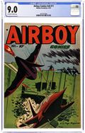 Cover by Ernest Schroeder. Stories and art by Ernest Schroeder and others. One of the more fanciful and influential of 1940s aviator heroes, Airboy fights evil with his radio-controlled plane "Birdie" and its plethora of experimental flying tech. Sometimes listed as Airboy Comics #88. No issue # on cover; Vol. 8, issue #5 in indicia. Airboy investigates a mysterious, gigantic airplane from outer space and learns it's actually a space ark from a destroyed planet. The Heap confronts an inhuman jewel thief aboard the Berlin Express. An early steam-driven car is used by the Union during the Civil War. Airboy: The Great Plane from Nowhere; The Heap; Jung the Robber; All for a Little Boy; High Steppers; The Fabulous Trail; The Galloping Jockey. 48 pages, Full Color. Cover price $0.10.