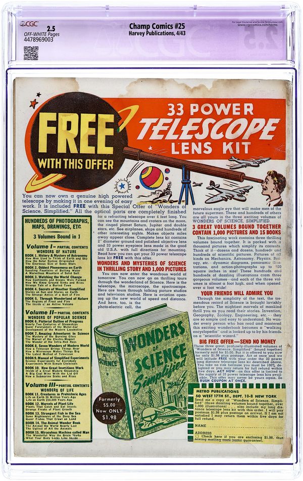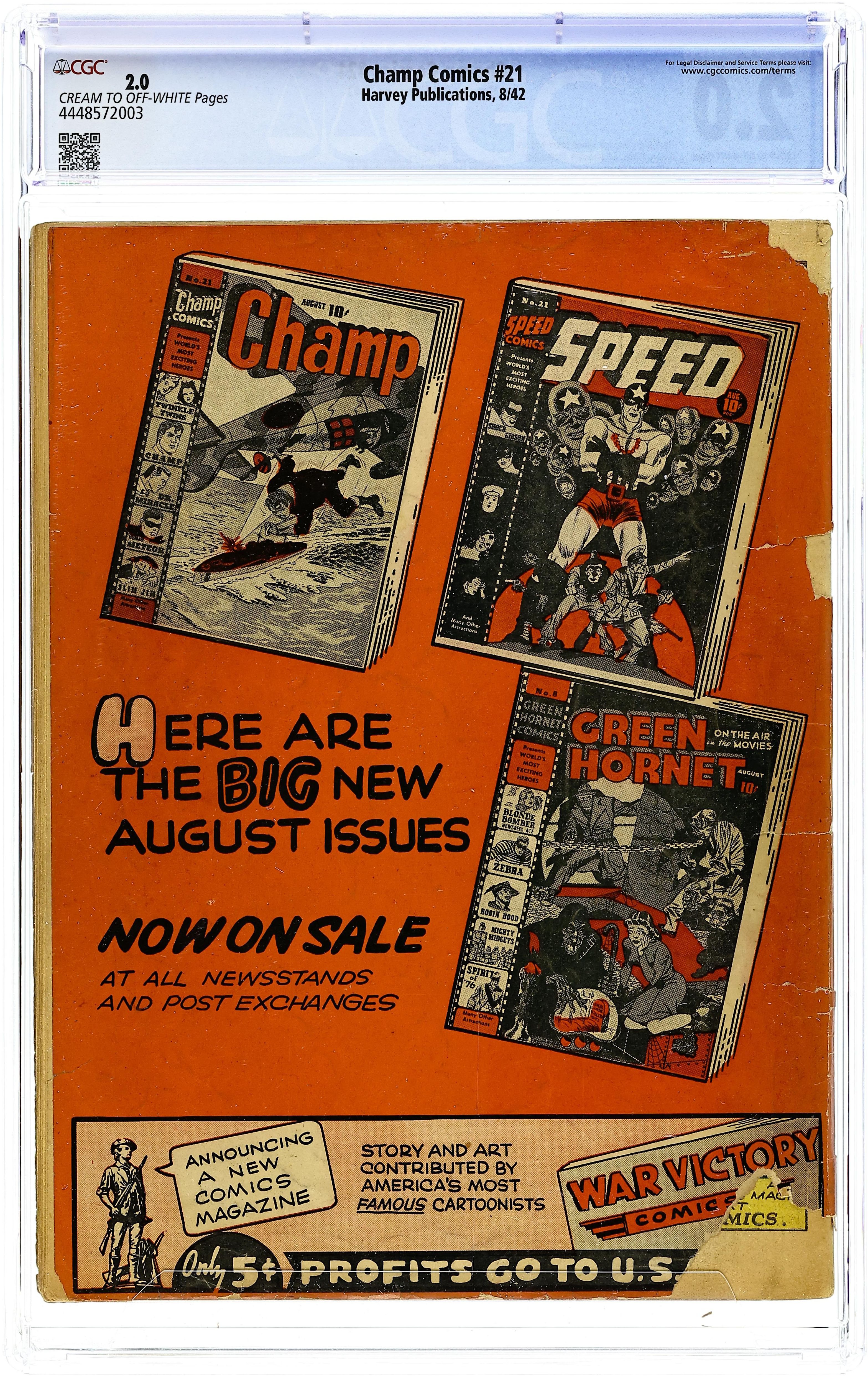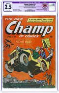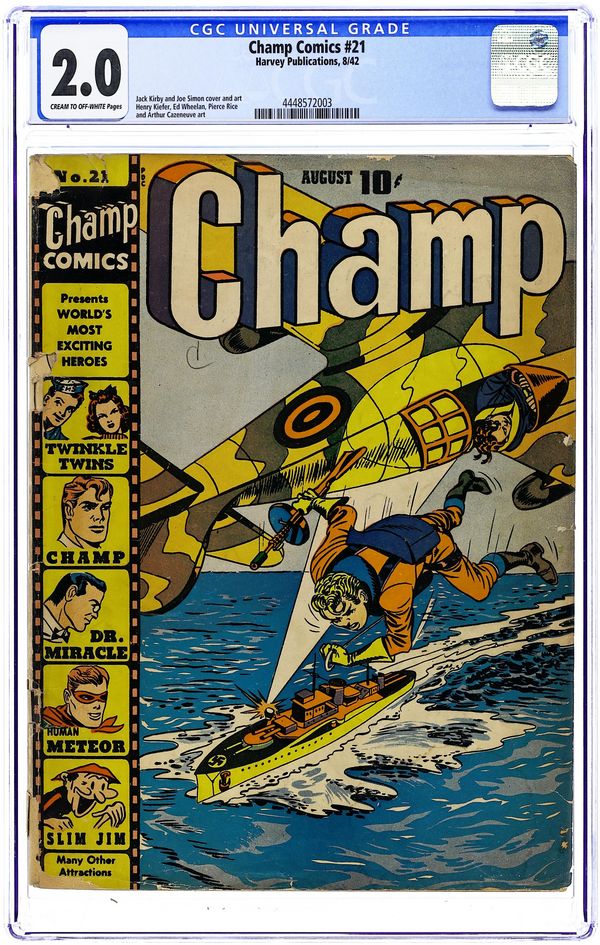 Stories and art by George Little, Bentley Wade, Harry Parkhurst, Robert Leslie Bellem, Art Helfant, Robert Turner, G. O. MacConachie, Henry Kiefer, G. Michaelis, Worth Carnahan, and Roy Nelson. Publisher Harvey makes an early entry in the superhero adventure genre with this anthology. Young Toby learns that Duke O'Dowd is secretly the Human Meteor, and becomes his teen sidekick, as they investigate The Traitors In the Lighthouse. Dr. Miracle seeks the secret of The Crook Who Survived the Electric Chair. Johnny Fox battles an arson ring. Plus illustrated guides to four Royal Air Force aircraft. Duke O'Dowd; Champ; Neptina; Dragon's Teeth; Dr. Miracle; Simple Snitz: The Smith Case; Johnny Fox; Champion Puzzler; Foul Shy; Liberty Lads; Aero Champs; Jungleman; Robinhood Jones; Champion Chuckles. 68 pages, full color. Cover price $0.10.