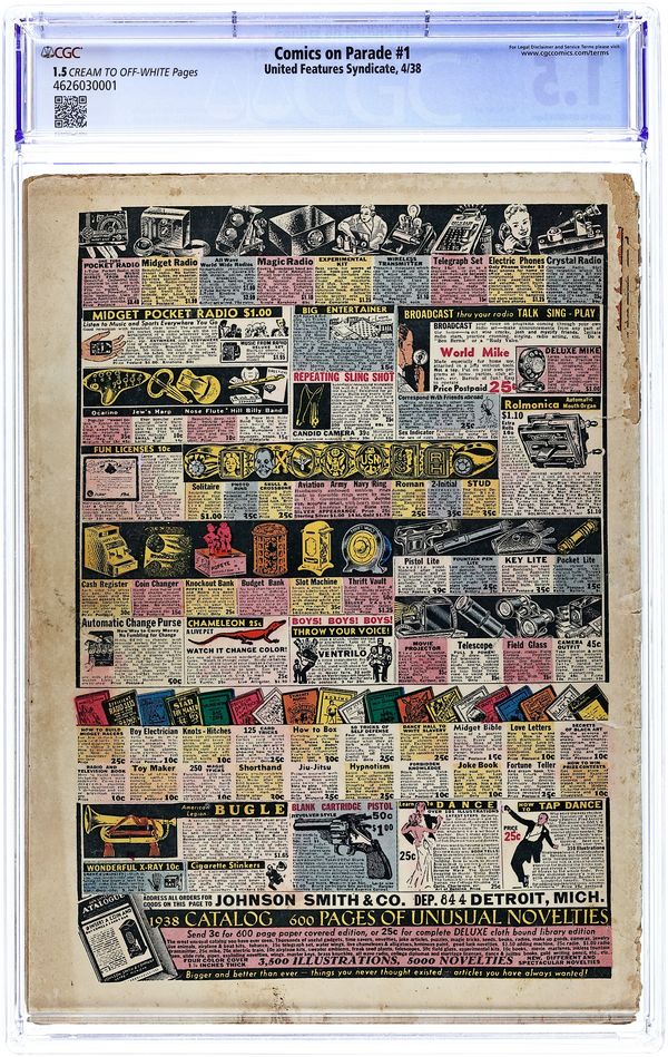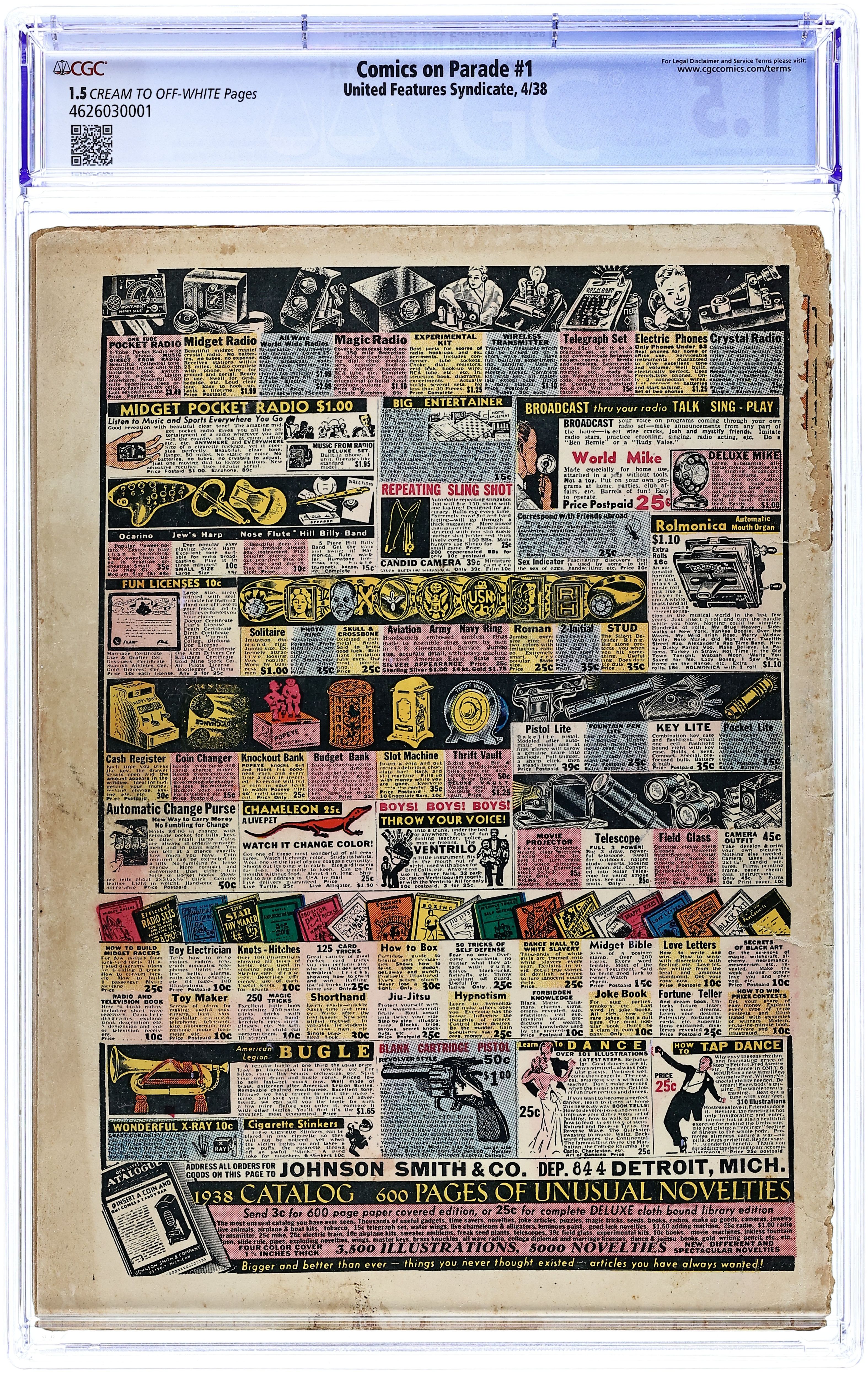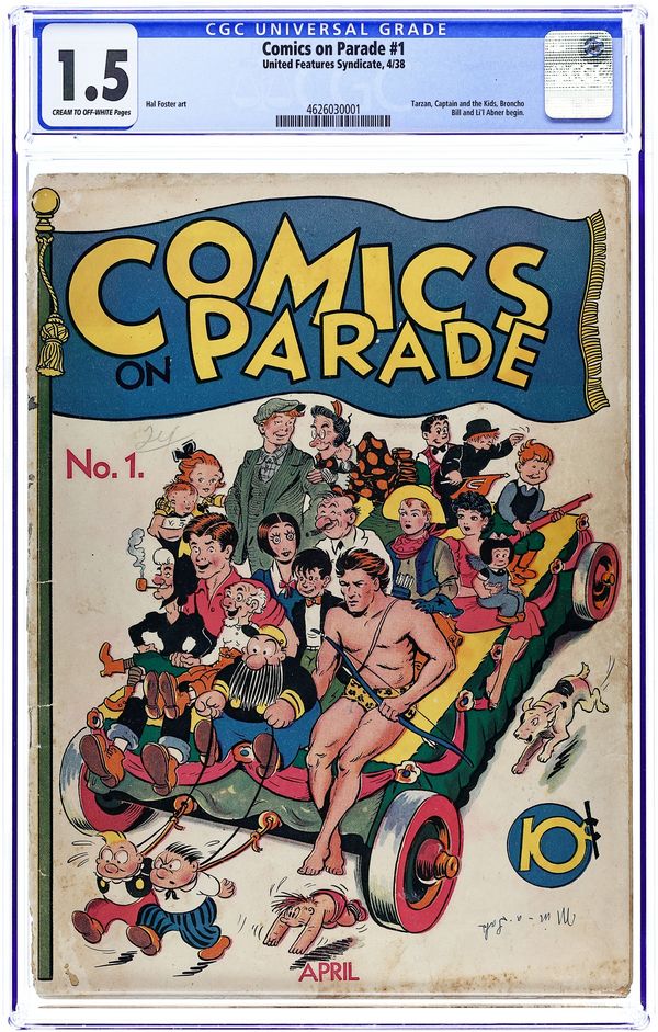 Stories and art by Hal Foster, Al Capp, Ernie Bushmiller, Bill Conselman, Charlie Plumb, Bernard Dibble, Fred Methot, Rudolph Dirks, Harry Lee, Winfield Meggs, Becky Sharp, Laverne Harding, Harry O'Neill, H. E. Homan, Dudley T. Fisher Jr., Robert Dickey, R. M. Brinkerhoff, J. Carver Pusey, Paul Berdanier, Frank Owen and Raeburn Van Buren. Sometimes listed as Comics on Parade Vol. 1 #1. Early in the transformation of comic strips to comic books, United Features Syndicate published Comics on Parade as a showcase for its most popular strips, including Tarzan, Li'l Abner and Nancy. This issue features the debut comic-strip adventures of Tarzan (by future Prince Valiant artist Hal Foster), Al Capp's Li'l Abner, and Raeburn Van Buren's Abbie and Slats. In the latter, country spinster Abbie meets her orphaned cousin Aubrey for the first time. She knows he's a city boy, but she's not prepared for the rough-and-tumble teen who calls himself "Slats." Shipwrecked on the African coast, the infant son of Lord Greystoke is raised by great apes to become Tarzan. Plus an illustrated biography of screen legend James Cagney. Terrific cover features a parade-float's worth of classic 1930s comic-strip characters, the familiar mingling with the forgotten. Danny; Abbie an' Slats; The Captain and the Kids; Tarzan of the Apes; Wayne Webster of Waverly Prep; Roads of Romance; Jest di-Jest; Cynical Susie; Broncho Bill; Looy Dot Dope; Colonel Wowser; How to Make It; For Junior Readers; Joe Jinks; Fritzi Ritz; Billy Make Believe; Mr. and Mrs. Beans; Bucky and His Pals; Little Mary Mixup; Benny; Opportunity Knox; If You Want to Know; Ella Cinders; Danny Dingle; Dub Dabs; Li'l Abner; Jasper. 64 pages, Full Color. Cover price $0.10.