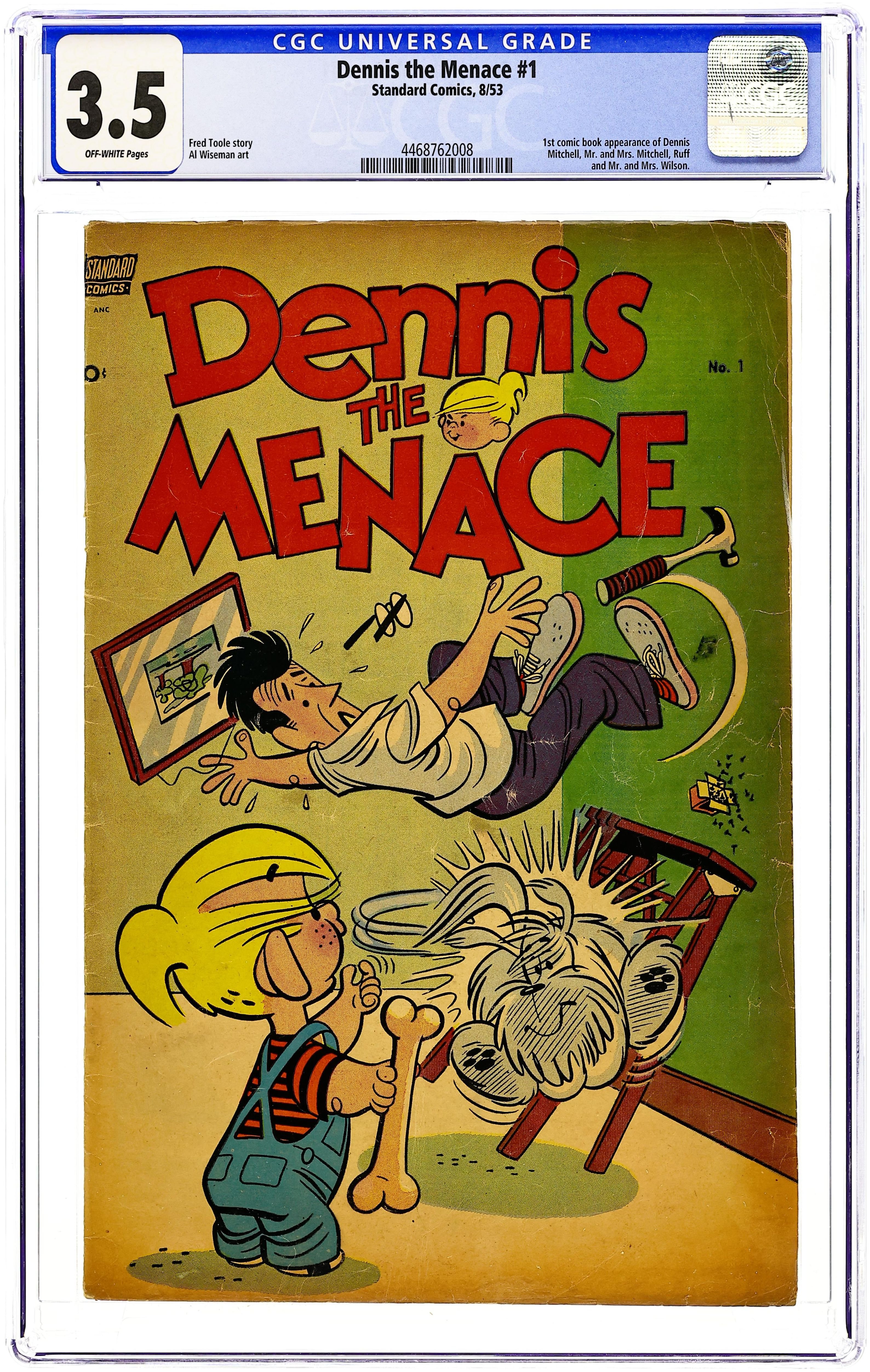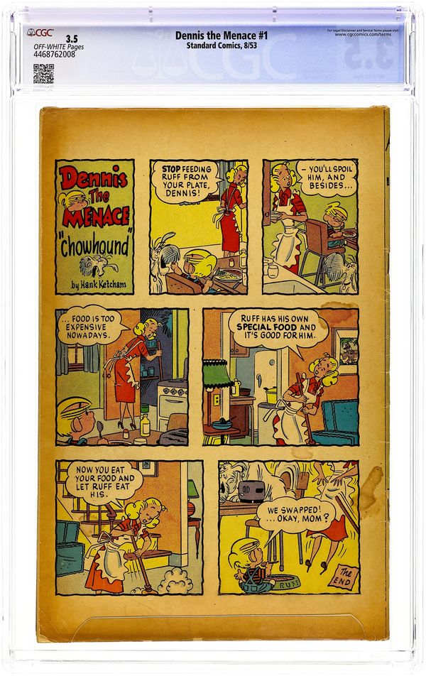 Cover by Hank Ketcham. Stories and art by Hank Ketcham and Al Wiseman. Five-year-old Dennis is a concern to his parents, a crisis to his teachers, and a menace to grumpy neighbor Mr. Wilson. Dennis enlists his friends to catch a bank robber when he hears that the reward is 100,000 ice cream cones. Henry gets pulled over after Dennis tries to steer the family car. Dennis spends the afternoon at the zoo, much to the animals' regret. Half-Pint G-Man!; Dennis Mows Em Down; Pome Pages; Driving Crazy; Dennis Vs. the Zoo; Dennis Vs. the Hiccups; Dennis' Taking Ways; Chowhound. 32 pages, Full Color. Cover price $0.10.