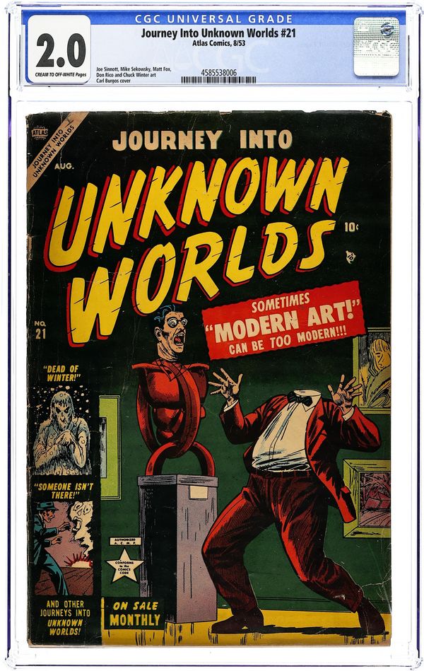 Decapitation cover pencils by Carl Burgos. Stories by unknown. Art by Don Rico, Joe Sinnott, Chuck Winter, Bob McCarthy, Mike Sekowsky, Matt Fox and Louis Zansky. Sometimes "Modern Art" can be too modern! Don't miss this tale with art by Don Rico. Also in this issue: "The Most Hated Man in the World" with art by Joe Sinnott; "What's Going on Here?" with art by Chuck Winter; "Someone Isn't There" with art by Bob McCarthy; "The Dead of Winter" with art by Mike Sekowsky and Matt Fox; and 2-page text story "The Birdmen!" with art by Louis Zansky, reprinted from Venus (1948 Marvel) #17 (original title: "The Madmen of Mogan"). 32 pages, full color. Cover price $0.10.