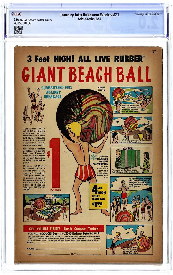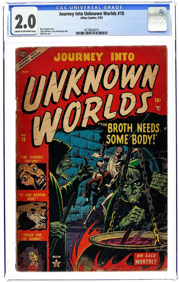 Cover art by Bill Everett. "The Ice Monster Cometh!", art by Gene Colan; A woman who scoffs at local tales of an 'ice monster' plots to get rid of her husband and pin the blame on the 'ice monster'; She has the tables turned on her when the accomplice she picks to aid her in her crime reveals himself to be...the Ice Monster. "The Lost City," pencils by Sheldon Moldoff; A pilot finds himself in a lost city at the ocean floor while charting a hurricane where men have their mouths sewn shut in order to prevent them from telling the secret. "The Woman Who Was Afraid of Birds" text story. "Harry's Hideout," art by Carl Hubbell; A murderer seeks a hiding place and unknowingly enters a time capsule. "Tough Guy," art by John Rosenberger; Bart Nelson is too tough for the demons of hell--nothing they do to him has any effect until they come up with a rather unique torment. "The Great Disappointment!", script by Stan Lee, art by Russ Heath; A Soviet expedition lands on the moon, but the cosmonauts are absorbed into the surface; American scientists observing this admit that they knew that the moon was a dangerous living organism, which is why they allowed the Soviet Union to reach it first. 36 pgs., full color. Cover price $0.10.