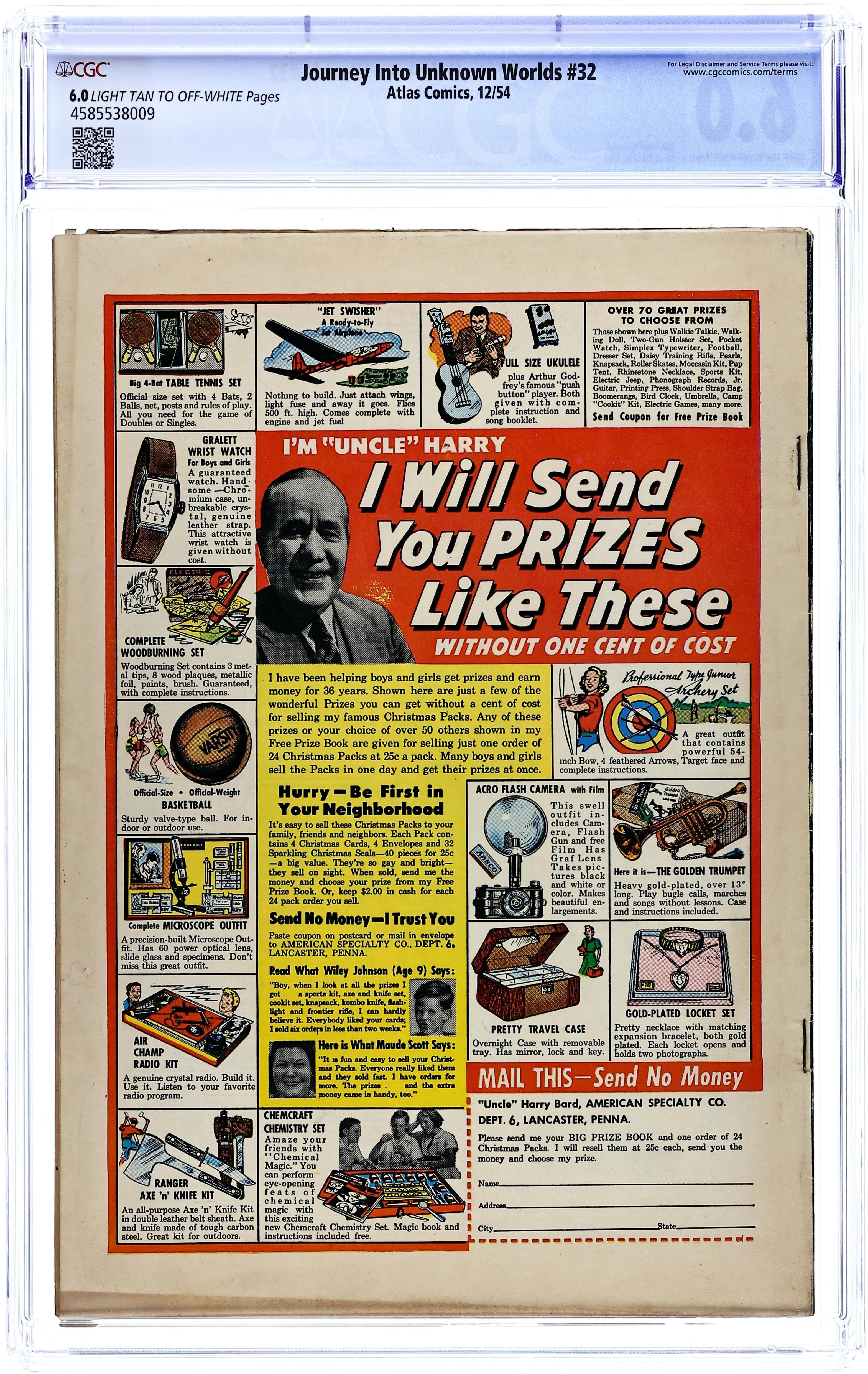 Starts Jan 3 "The Men Who Conquered the Earth," art by Russ Heath; An inventor attempts to unify the countries of Earth by building a ray which will draw Mars close enough that its rocket ships can launch an attack; He realizes his mistake when the Martian forces begin to get the upper hand. "Escape from Death!", art by Joe Maneely; A criminal condemned to die in the electric chair has planned for his mob to short circuit the electrical power and spring him, but the warden tells him that they arrested three of his men earlier; The man thinks the warden is trying to rattle him as he sits in the chair and the switch is thrown. "In the Valley of the Mist" text story. "Planet of Terror!", art by Basil Wolverton; An Earthman sets himself up as a god among primitive Saturians. "The House That Wasn't There," art by Paul Cooper; A mailman who desires the job of postmaster finds he has a natural gift to see the inhabitants of time-space and they want him to come with them so that he may be involved with an exciting new experiment. 36 pgs., full color. Cover price $0.10.