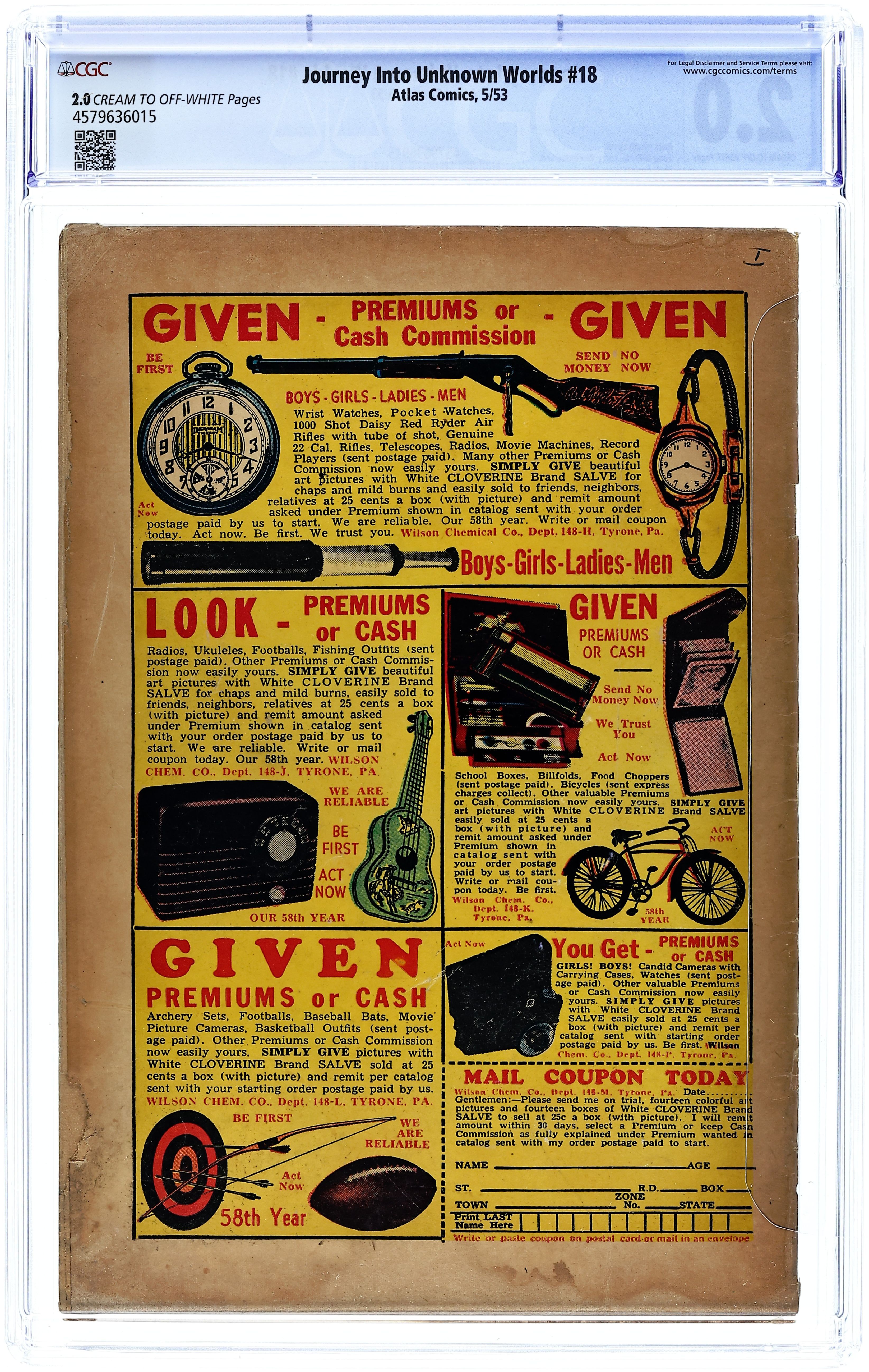 Cover by Harry Anderson. "Vampire Tale," art by Doug Wildey; A man wrapped in bandages is on trial for murder after slaying a vampire. "The Curse" text story. "Man Alone!," art by Al Eadeh; Communists get the idea to swap a spy for the village idiot in a centrally located village by taking a hermit and training him to pass for the idiot. "The Man Who Wasn't," art by Bill Walton; A man invents a youth serum and wishes to give it to the oldest member of an old folks home, but the man doesn't want it. "The Vultures," art by Mannie Banks; Unknown to his children, a man leaves his estate to the ones who attend his funeral. "The Question!," art by Vic Carrabotta; An inventor who loves his wife asks an electronic brain which he devised two questions, 'When will my wife die?' and 'When will I die?' 36 pgs., full color. $0.10. Cover price $0.10.