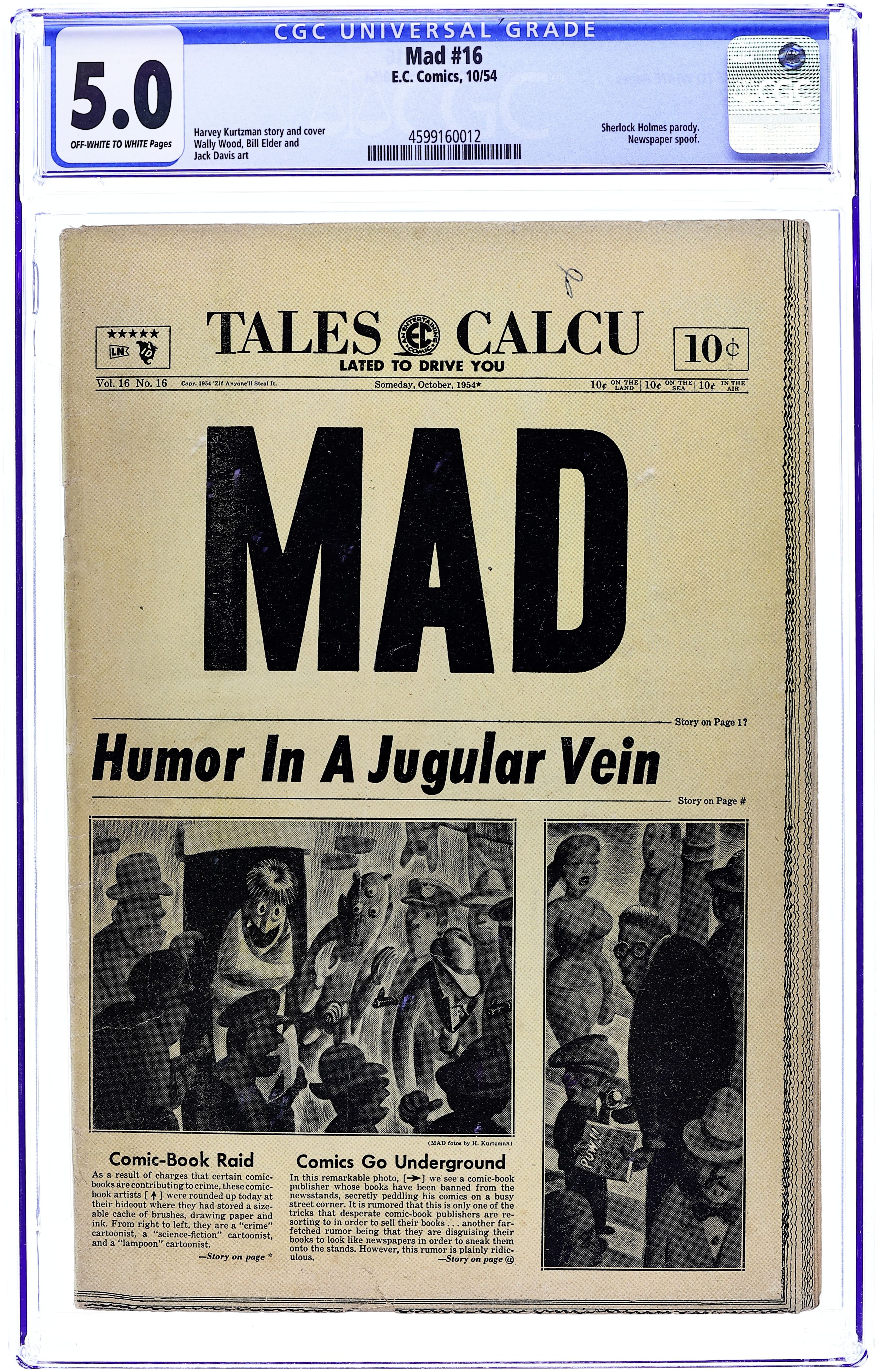 Cover by Harvey Kurtzman. "The Hound of The Basketballs!", art by Bill Elder; Shermlock captures the hound that has cursed the Basketball family; Parody of Sherlock Holmes mystery. "Newspapers!", art by Jack Davis; Various fake newspaper stories and ads. Ad for Piracy comic book. "Restaurant!", art by Bill Elder; The deprivations the Sturdleys suffer at a "typical" Sunday restaurant outing. "Wreck of The Hesperus," script by Henry Wadsworth Longfellow, art by Wallace Wood; Relates the wreck of the ship Hesperus on the reef at Norman's Woe; Text of the famous poem accompanied by humorous illustrations. 36 pgs., full color. $0.10. Cover price $0.10.