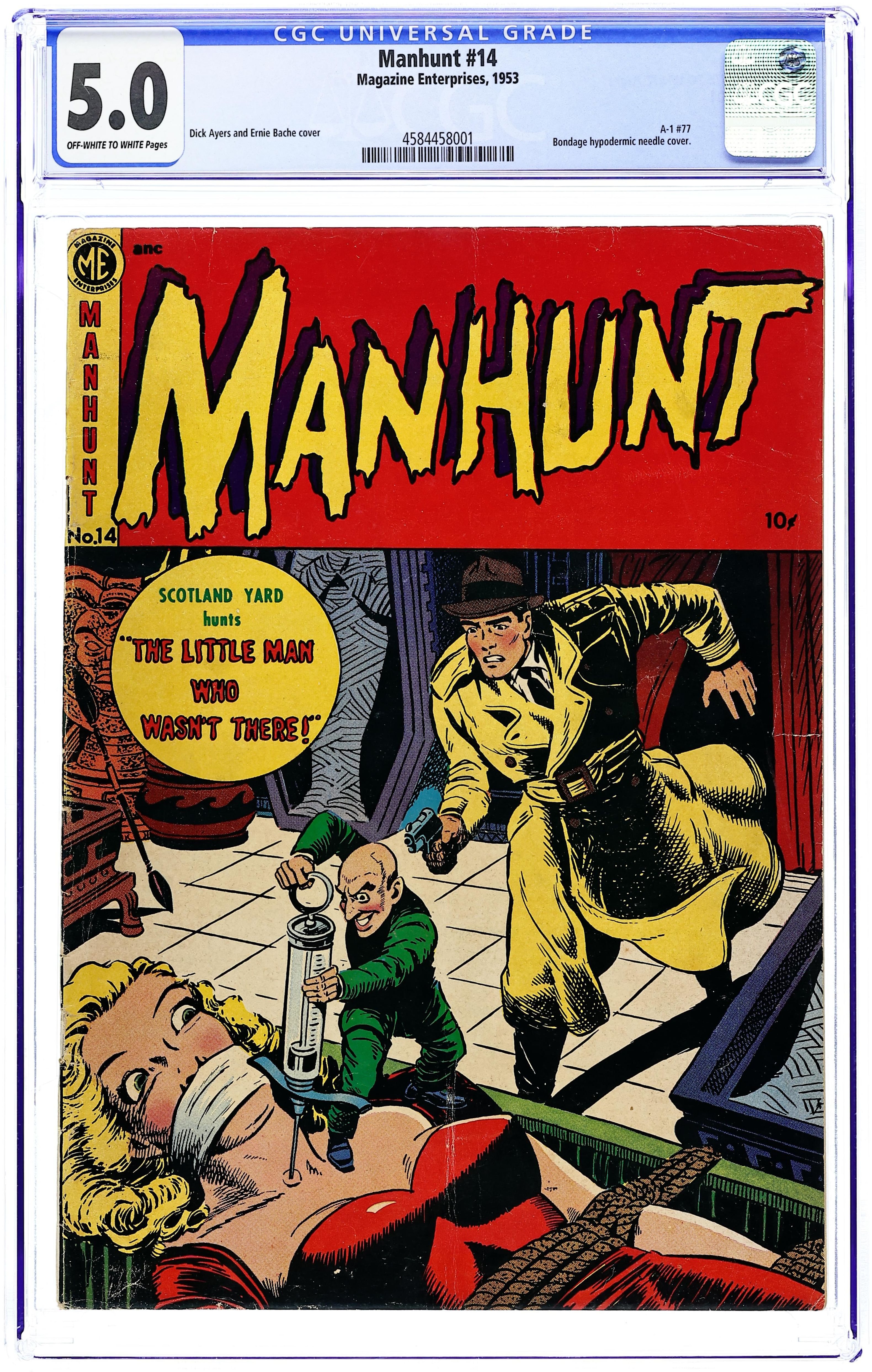 (A-1 #77). Cover pencils by Dick Ayers, inks by Ernie Bache. "The Enemy Within," art by Ogden Whitney; Agent Fallon infiltrates a communist cell trying to take over the maritime unions; Reprinted from issue #5. "The Little Man Who Wasn't There," art by Paul Parker; Kirk pursues a thief who has perfected a shrinking formula; Reprinted from issue #10. "The Trail of the Curious Pin," art by Ogden Whitney; Undercover Girl must find the pin that contains the message another spy was bringing her before she was captured by enemy agents; Reprinted from issue #11. "The Terror of the Forest Trail," art by L. B. Cole; Red Fox must find out who has been killing every doctor that comes to Barren Bay; Reprinted from issue #9. "The Ledger That Told the Truth," pencils by Graham Ingels; The Duke exposes Fang's rackets on the waterfront; Reprinted from issue #9. 36 pgs., full color. Cover price $0.10.