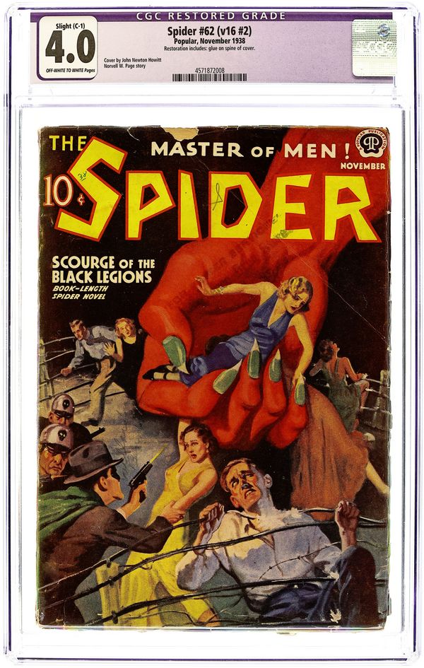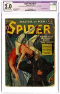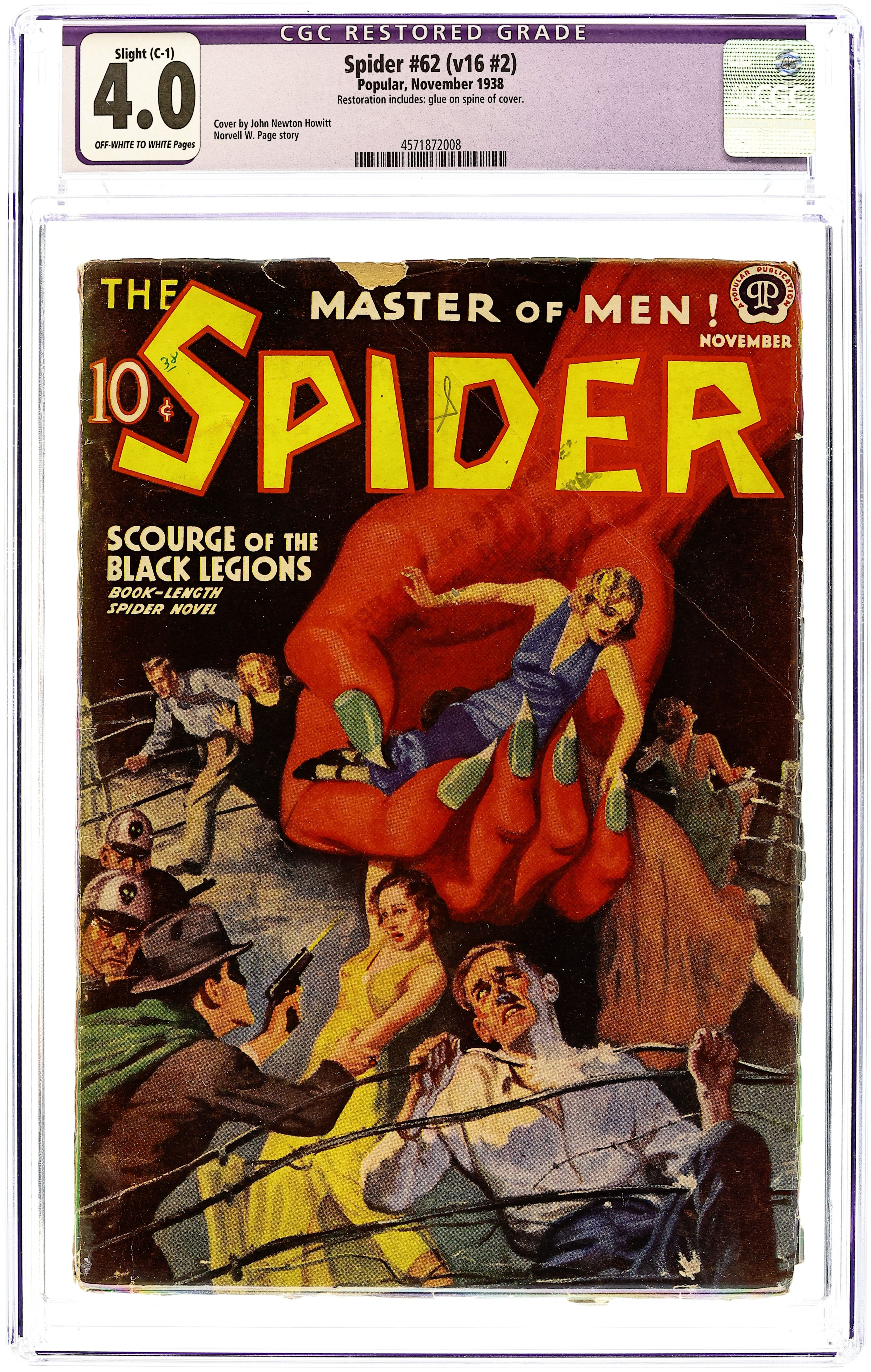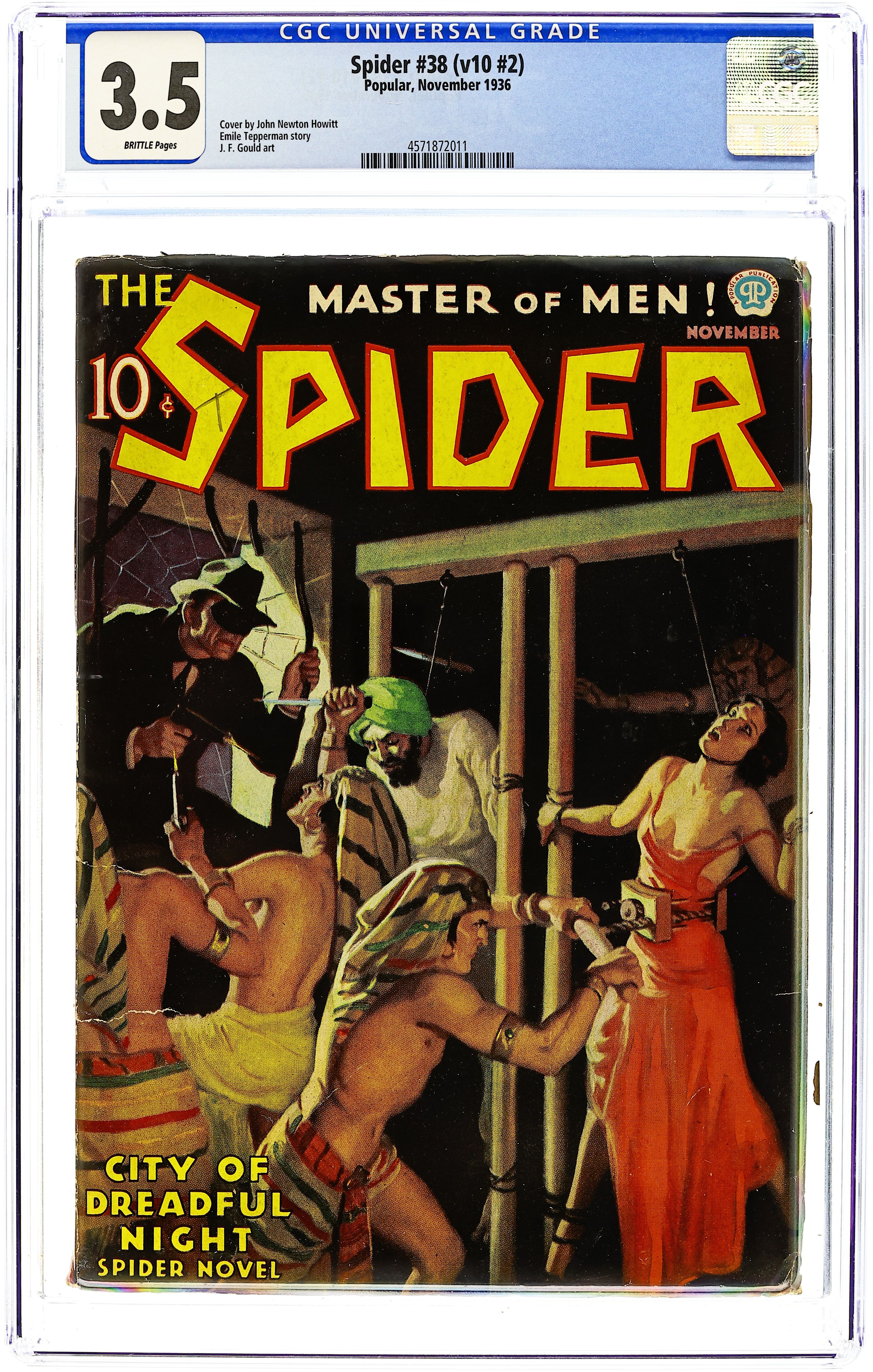 Oct 1938. Cover by John Howitt. Spider Story by Grant Stockbridge "The Spider at Bay". "Never Bet on a Corpse" by J. Lane Linklater and "The Witness From Hell" by Arthur Leo Zagat. Crime-fighting article by Moran Tudury. Illustrations by J. Fleming Gould. 7" x 10", black and white; 112 newsprint pages. Cover price $0.10.