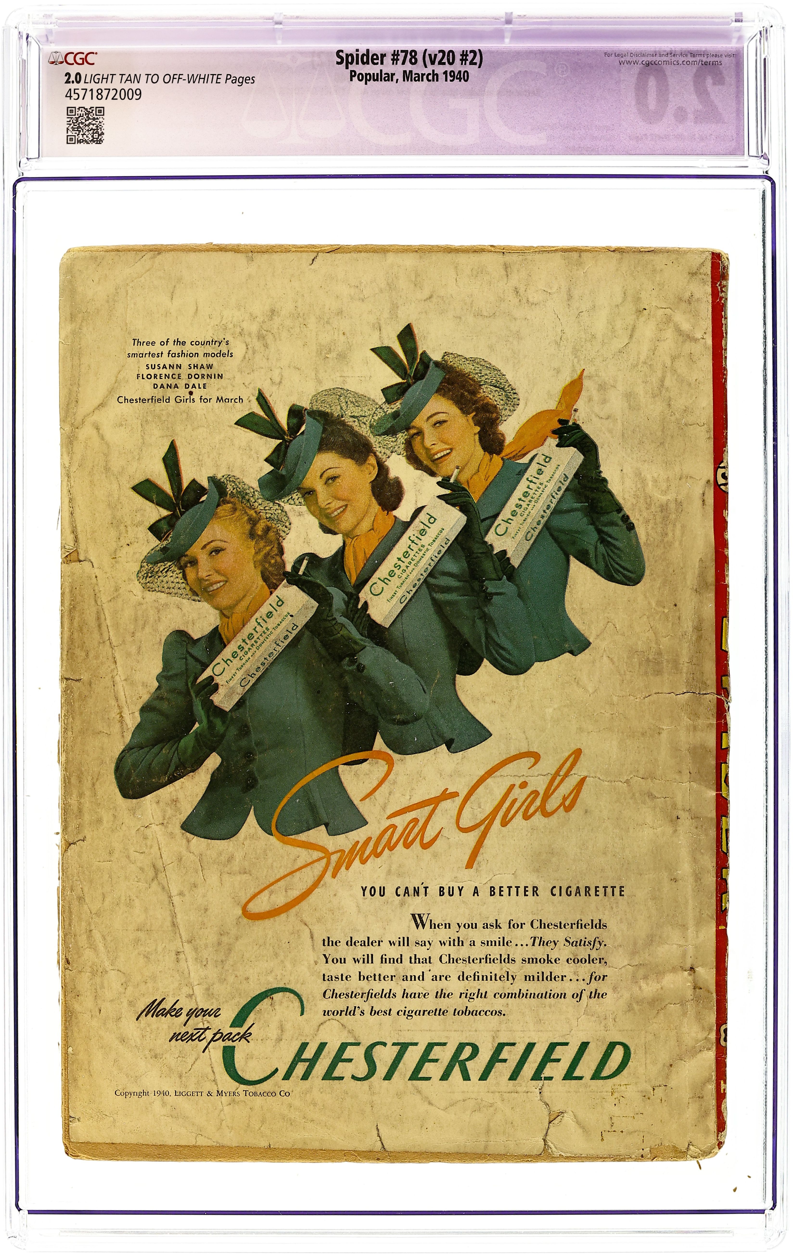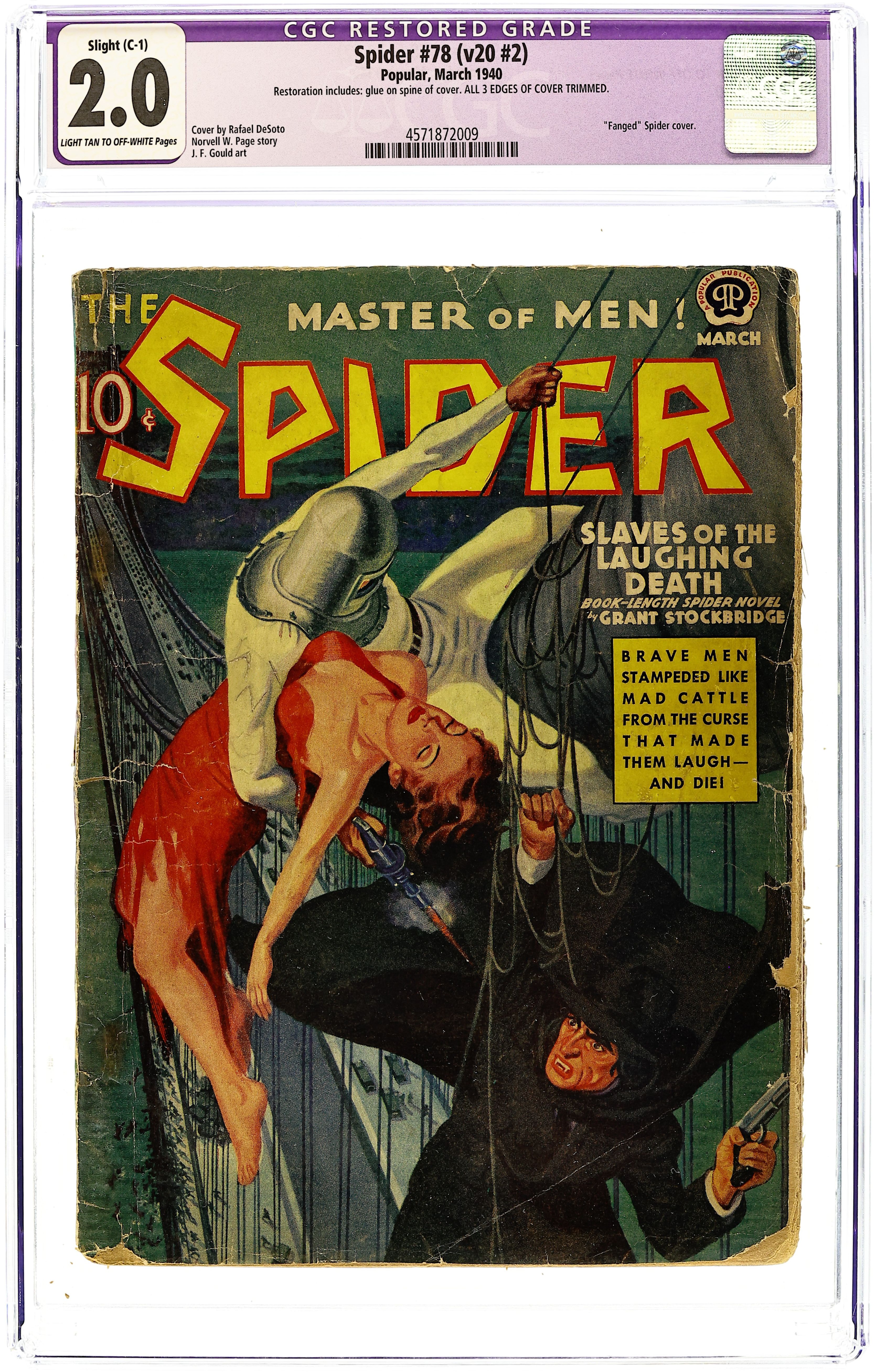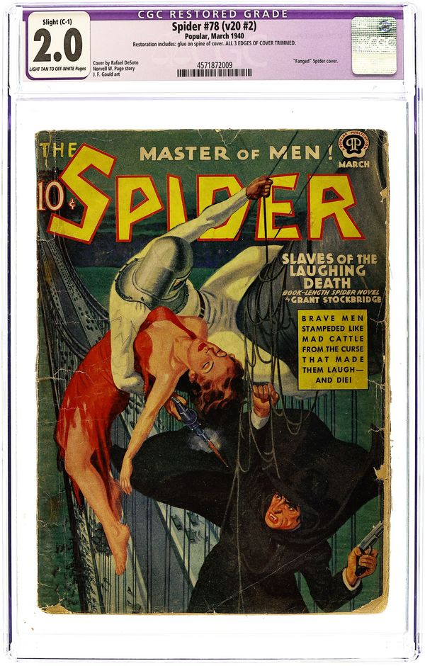 March 1940. Spider Story by Grant Stockbridge "Slaves of the Laughing Death". "The Devil's Clearing House" by Wayne Rogers and "Blood Can't Buy Brides" by Costa Carousso. Illustrations by J. Fleming Gould. 7" x 10", black and white; 112 newsprint pages. Cover price $0.10.