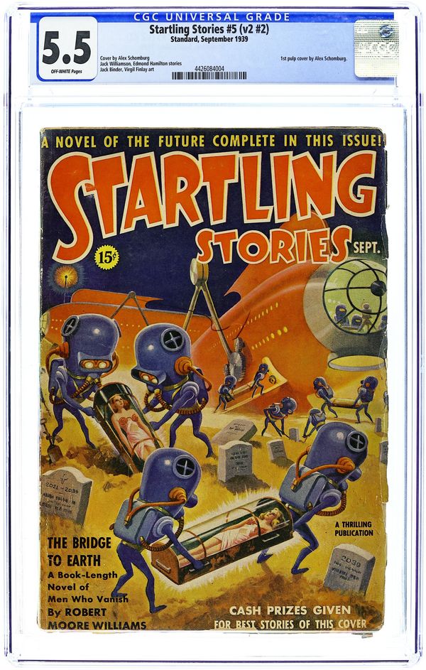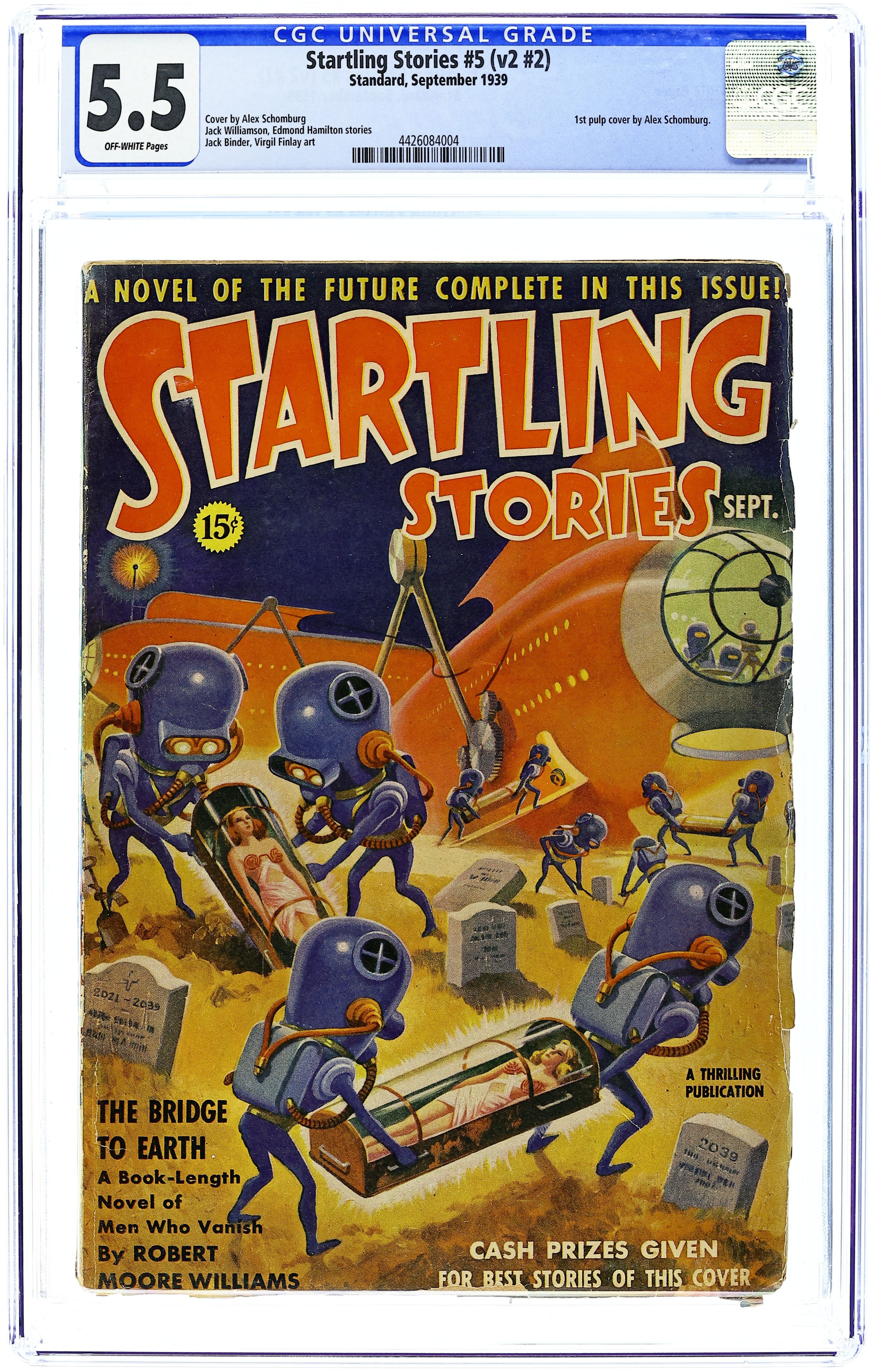 Sept 1939. Cover by Alex Schomburg (1st pulp cover by Alex). Stories by Robert Moore Williams, Robert Arthur, John Russell Fearn, and Edmond Hamilton. "Thrills in Science" by Mort Weisinger. Two-page Alfred Bernhard Nobel bio in comic form. Virgil Finlay illustration. 6.75-in. x 9.75-in.; black and white; 128 pages. Cover price $0.15.