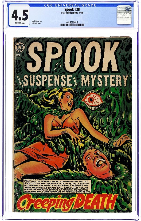 Cover by L. B. Cole. Stories and art by Jay Disbrow and George Appel. Pre-Code horror comics from L. B. Cole's Star Publications. In one of the all-time classic lab accidents, an amoeba gains massive size and intelligence, and runs amuck in the city. Red Rocket discovers a plot to replace human babies with Martian mutants. Amazo enslaves a village and battles jungle hero Rulah, but falls afoul of her own superstition, featuring art possibly by good-girl art legend Matt Baker. Creeping Death; Death Dance; Red Rocket: The Monstrous Madmen; Rulah: Jade of Death. 36 pages, full color. Cover price $0.10.