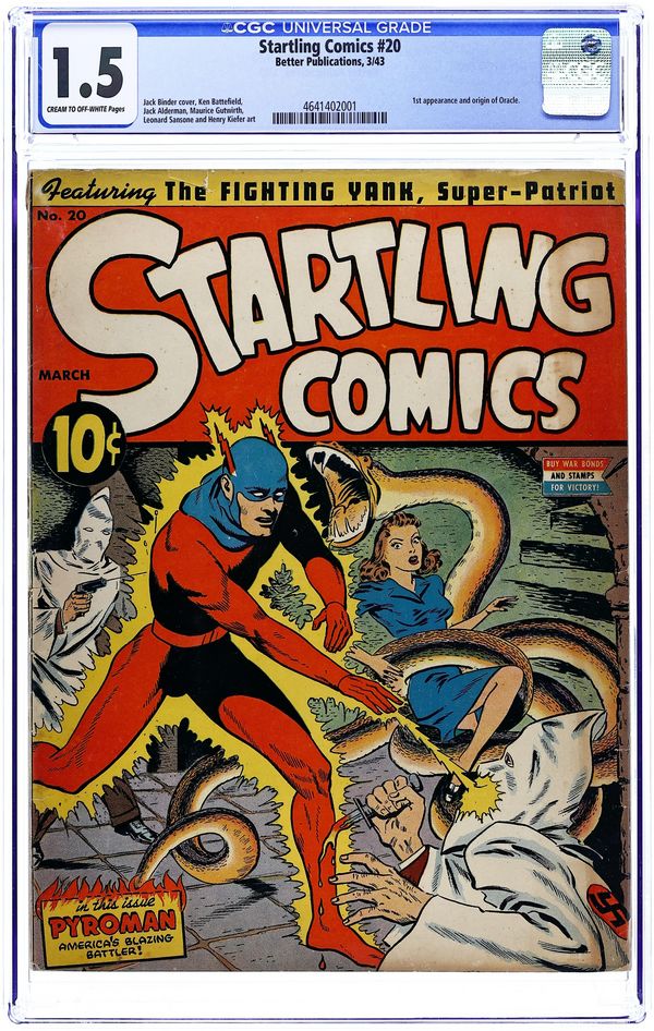 Cover art by Jack Binder. Pyroman story, art by Jack Binder; Venom and the Black Boas attack. Fighting Yank story with the Scorpion. For Freedom text story by Lew Williams. Captain Future story, art by Jack Alderman. Four Comrades story with Black Satan and the Dwarf, art by Maurice Gutwirth. Refugee Boy text story by Johnston Carroll. Oracle origin story, art by Henry Kiefer. Slip Ahoy story. Boy Volunteer text story by James Jackson. Don Davis / story, art by Leonard Sansone. 68 pgs. $0.10. Cover price $0.10.