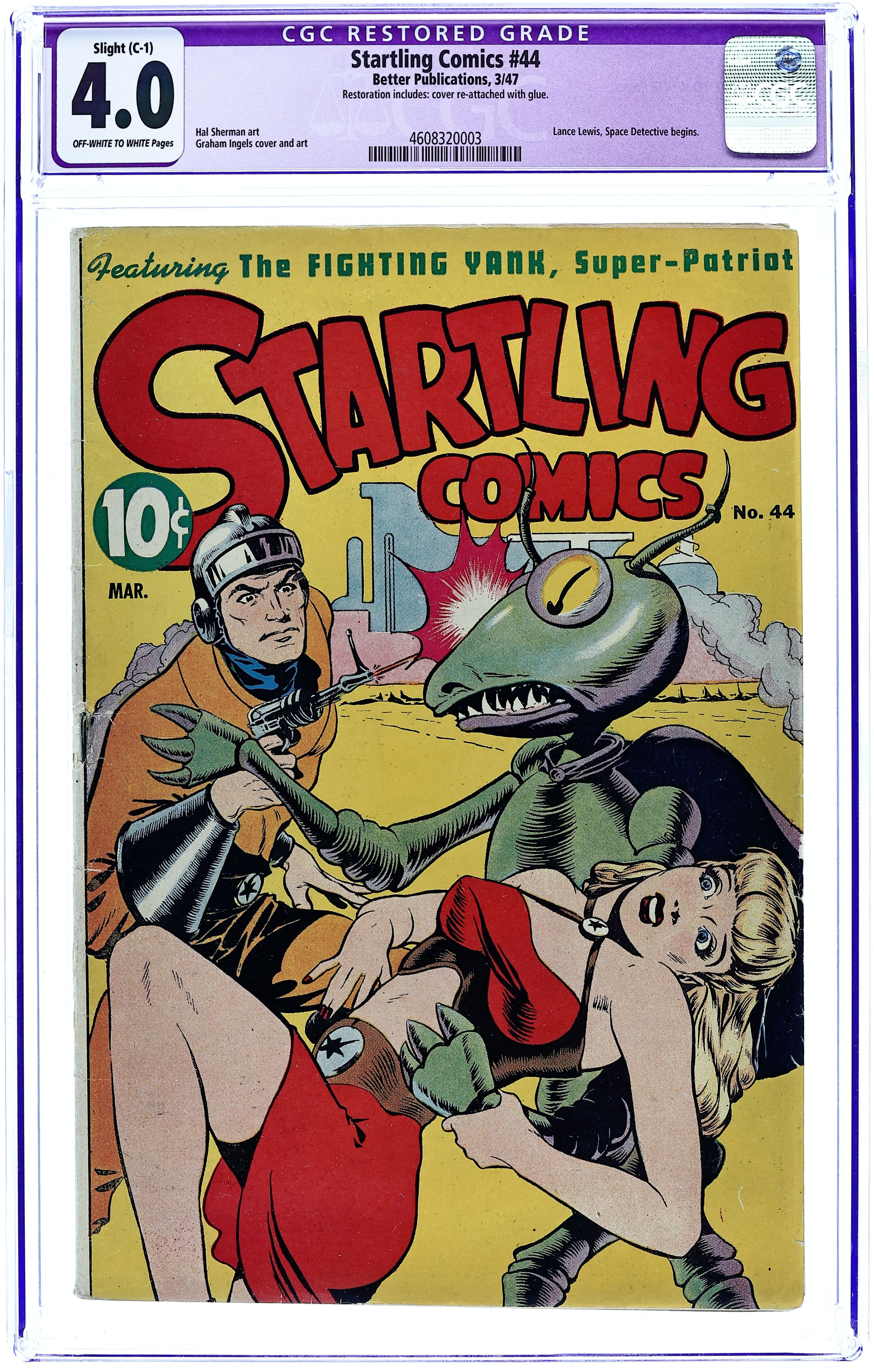 Cover art by Graham Ingels. Lance Lewis story (introducing the space detective). Curtis funny animal filler page. Case of the Punch-Drunk Portrait starring Fighting Yank, art by Ken Battefield. Airminded Rollo filler page, art by Al Hartley. Eyes of the Jungle text story by Donald Bayne Hobart. Jefferson Jones story, art by Hal Sherman. Company Guard text story William McClellan. Death in the Doll House starring Front Page Peggy. 52 pgs. $0.10. Cover price $0.10.