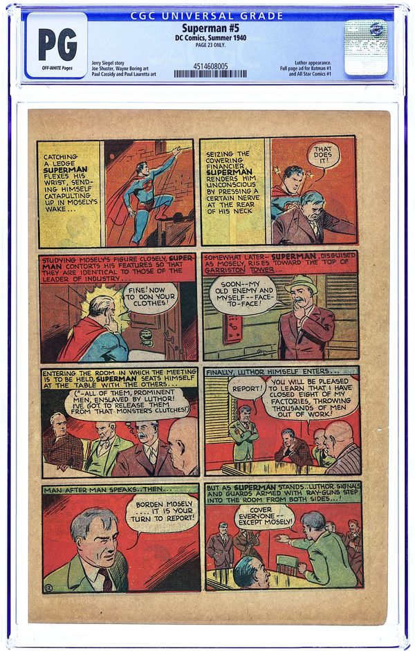 Cover pencils by Wayne Boring. Untitled Superman story, script by Jerry Siegel, pencils by Paul Cassidy (pages 1-8) and Wayne Boring (pages 9-13) [as Joe Shuster], inks by Paul Cassidy (pages 1-8) and Paul Lauretta (pages 9-13) [as Joe Shuster]; Lois and Clark are very concerned when they see business owners trying to induce children into their stores to play slot machines, placed there by the goons of "Slug" Kelly. Superman's Super Strength: Rules for Summer Living. Supermen of America club info. Untitled Superman story, script by Jerry Siegel, art by Paul Cassidy; Punk politician Alex Evell, because of his growing political power, is out to buy the Planet's competitor, so that he will have a newspaper to back up his political dealings. Power of the Press text story, script by George Shute, art by Bernard Baily. Untitled Superman story, script by Jerry Siegel, pencils by Joe Shuster, inks by Wayne Boring [as Joe Shuster]; Clark Kent smells a rat when he enters several offices of financial wizards, hoping to find out why they are profiting during a time of extreme depression. Murder In the Wind text story by Jack Wallis. Two half-page ads for All-Star Comics #1 and Batman #1. Untitled Superman story, script by Jerry Siegel, art by Paul Cassidy; Superman investigates why a noted chemist's serum, parabiolene, financed by a noted gangster named Carlin, is being used on noted people, making them virtual slaves to do the bidding of Carlin. Promotional ad for Action Comics. 68 Pages, Full Color. Cover price $0.10.