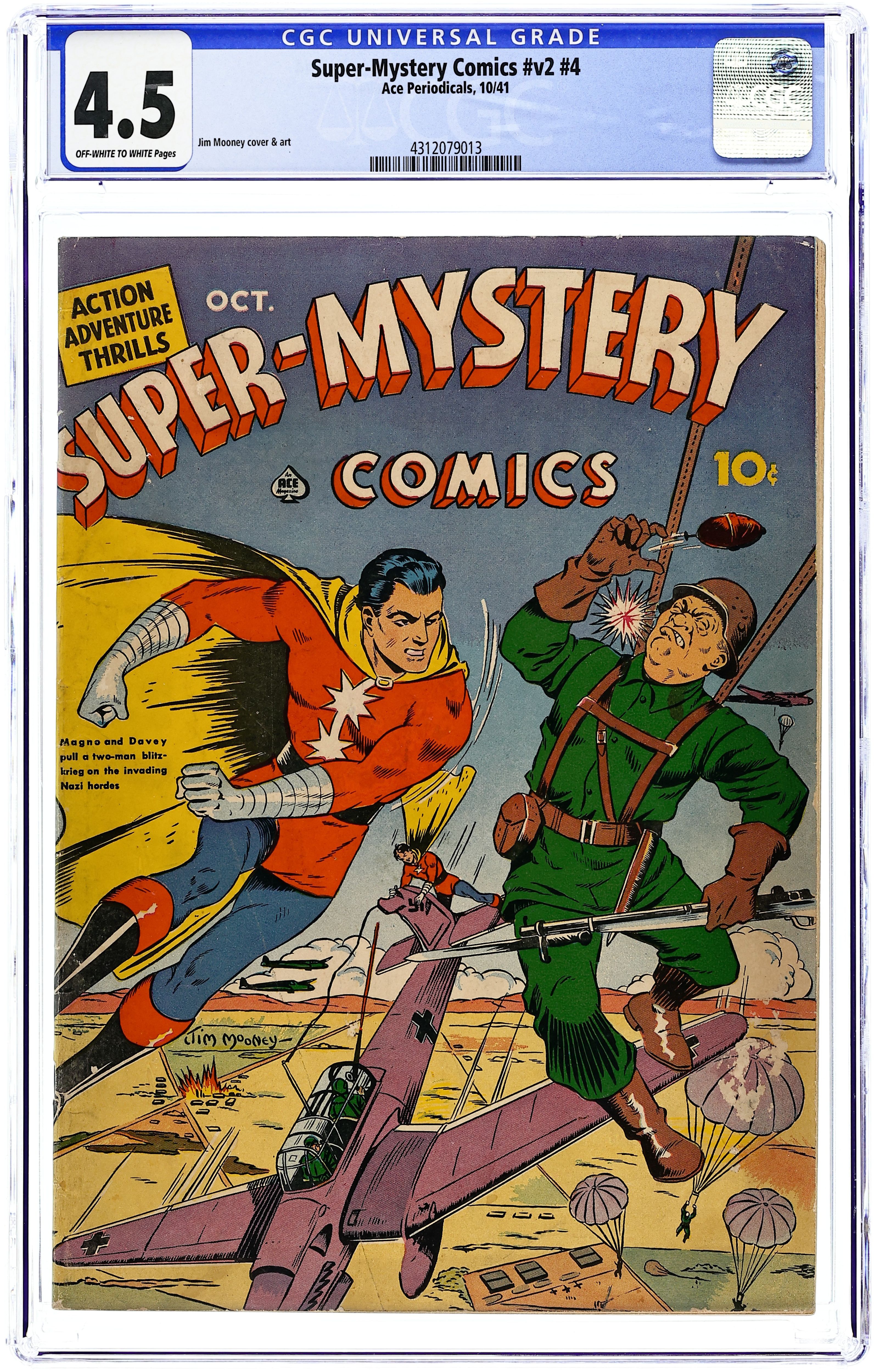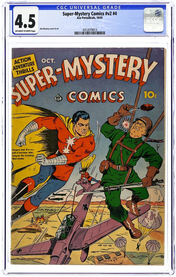 Cover art by Fred Ray. Untitled Superman story, script by Jerry Siegel (signed), pencils by Paul Cassidy [as Joe Shuster], inks by the Shuster Shop [as Joe Shuster]; Superman battles against some members of the Committee Against Militarism, whose leader is actually employed by a warring totalitarian nation. Supermen of America ad. Sport Spotlight on Surprising Veterans featuring Fred Fitzsimmons, Gene Sarazen, Max Baer, Ted Lyons, and Lefty Grove. Untitled Superman story, script by Jerry Siegel (signed), pencils by Paul Cassidy (?) [as Joe Shuster], inks by the Shuster Shop [as Joe Shuster]; Superman prevents Judge Crane from committing suicide, and, after talking with the judge, discovers that his daughter has been kidnapped. Untitled Superman story, script by Jerry Siegel (signed), pencils by Paul Cassidy (?) [as Joe Shuster], inks by the Shuster Shop [as Joe Shuster]; Editor White sends Clark out to Lamson Laboratories to get to the bottom of an unknown person or persons causing problems at the lab in an attempt to force the W-142 formula out of Lamson. A Bombing Flight text story, script by Frank Cooper, art by Fred Ray. Superman Physical Development Club article. Ad for Batman #4 and the Superman Radio Show. Untitled Superman story, script by Jerry Siegel (signed), pencils by Paul Cassidy [as Joe Shuster], inks by the Shuster Shop [as Joe Shuster]; The death of Morton Carling leads Lois, Sgt. Casey and Superman to uncovering the fact that the Jackson Jewelry Company was a front for a murder syndicate. 68 Pages, Full Color. Cover price $0.10.