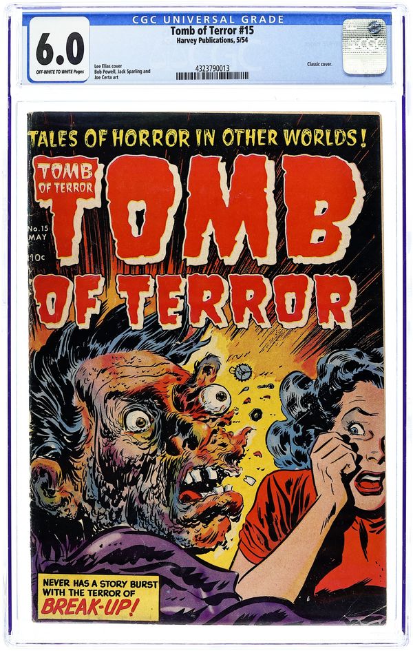 Cover by Lee Elias. Stories and art by Joe Certa, Bob Powell, Nat Barnett, and Jack Sparling. Tomb of Terror was one of Harvey Comics' notorious pre-Code horror comics. A scientist's wife decides to get rid of her husband's robot duplicate, then realizes she's made a horrible mistake. An explorer climbs inside a gigantic statue before realizing it's actually a living giant. Exploding-face cover by Lee Elias is one of the most notorious covers of the pre-Code era. The Dead Planet; Terror Tricks; Escape!; Mirror Image; Break-Up; Experiment; Dream...or Nightmare?; The Man Germ. 36 pages, full color. Cover price $0.10.