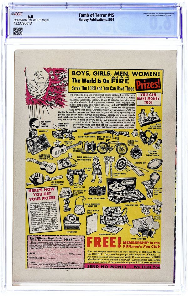 Cover by Lee Elias. Stories and art by Manny Stallman, John Giunta, Bob Powell, Howard Nostrand, and Jack Sparling. Tomb of Terror was one of Harvey Comics' notorious pre-Code horror comics. A scientist's evolving machine turns him into an advanced being, until he takes it too far. The series continues its trend of offbeat horror stories with a Western version of the classic Don Quixote. A man murders his brother....too bad they were Siamese twins. Evolution; Terror; The Story of the Witch/The Hand Behind the Head; Don Coyote: A Boo of the Month; Tale of Cain; Blind Alley; Terror Tricks; Gambling Fever. 36 pages, full color. Cover price $0.10.