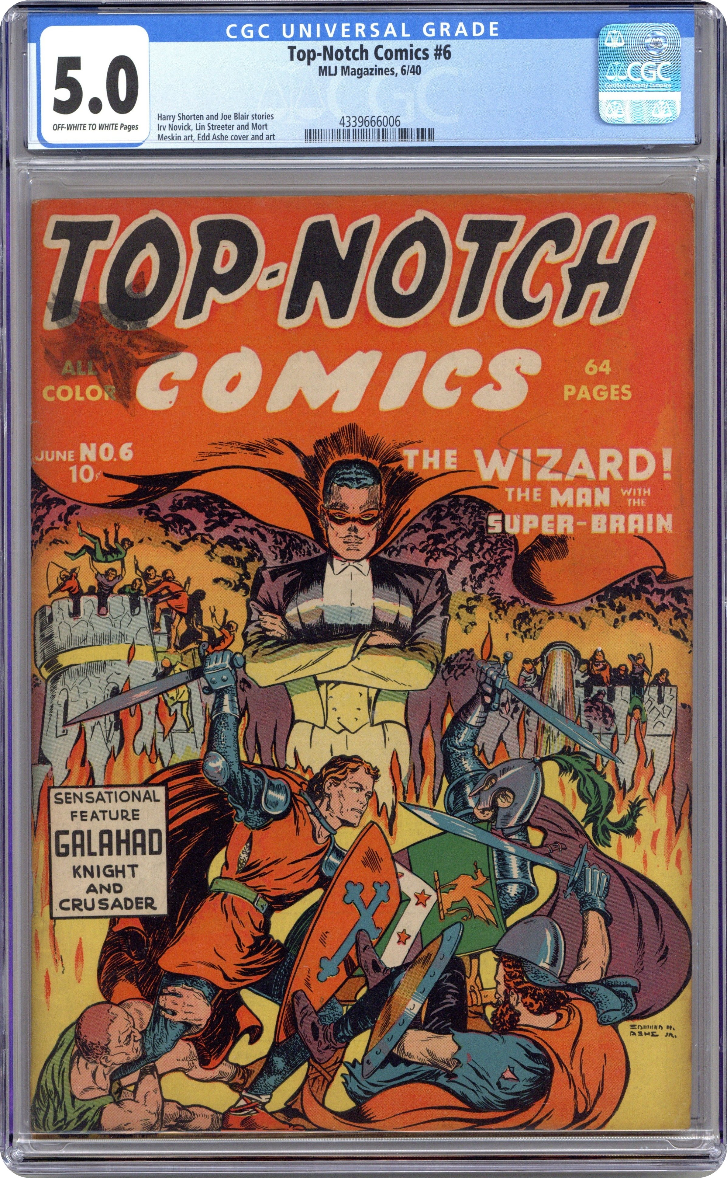 Cover by Edd Ashe. Edited by Abner Sundell. Stories by Will Harr, Edd Ashe, Harry Shorten, Lin Streeter, Joe Blair, Irv Novick, William Wills, Ed Smalle, Mort Meskin, Gerry Thorp, Ed Wexler, and C. A. Winter. Heroic tales of action and adventure—these are Top Notch Comics! 68 pages, full color. $0.10. Cover price $0.10.