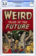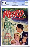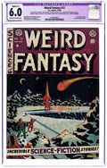 Al Feldstein classic outer space cover. "Mass Meeting" (art by Joe Orlando), "Skeleton Key" (art by Al Williamson), "What He Saw" (art by Jack Kamen), and "The Green Thing" (art by Orlando). The letters page comments on EC's Ray Bradbury adaptations with a disingenuous implication that the author approved them from the beginning. As is well-known now, Feldstein swiped the stories without authorization, but Bradbury called them on it, and soon an agreement was worked out in which EC paid Bradbury for the adaptations. NOTE: See 1st Series for 1950 #16. Cover price $0.10.