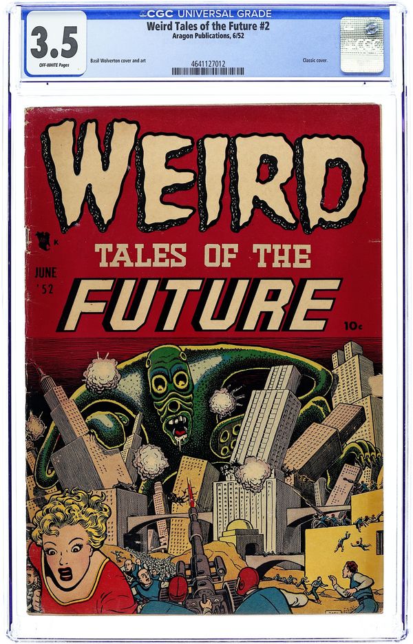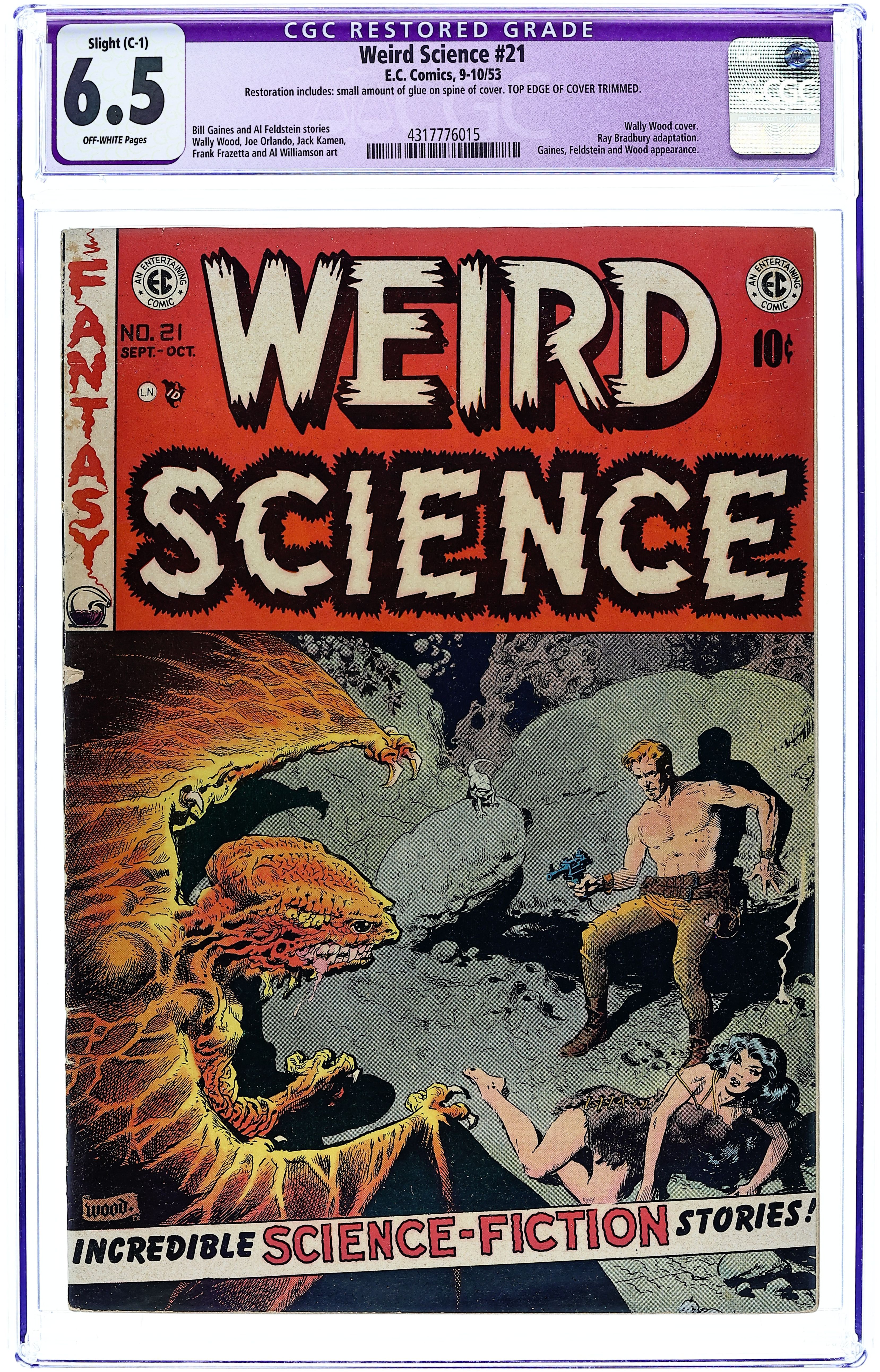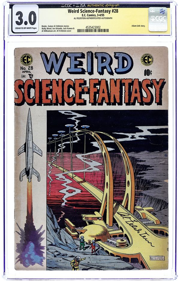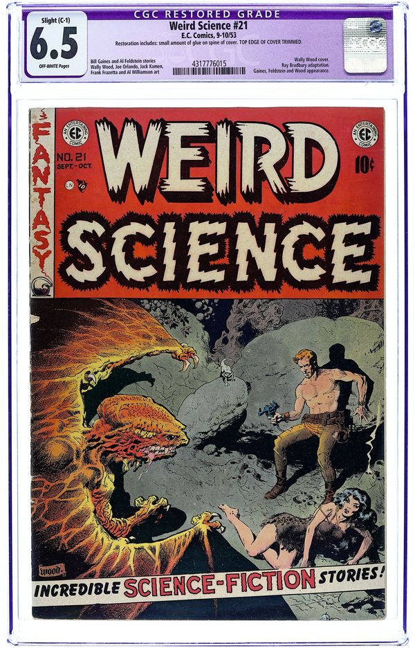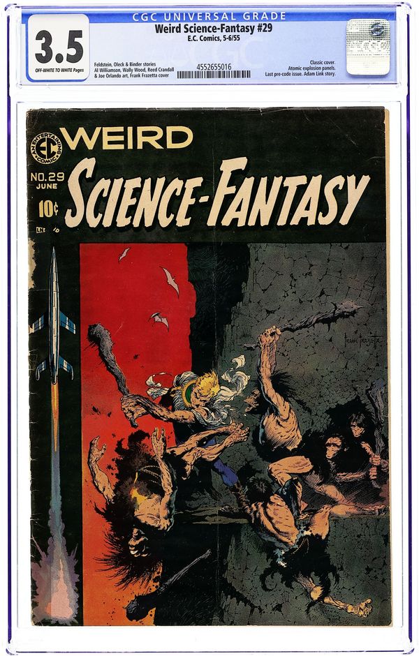 Final issue of the series (becomes Incredible Science Fiction). "The Chosen One" (art by Wally Wood), "Vicious Circle" (art by Al Williamson with Roy Krenkel), "Genesis" (art by Reed Crandall), and "Adam Link in Business" (art by Joe Orlando; from the story by Eando Binder). Classic Frank Frazetta cover sometimes cited as the greatest comic book cover illustration ever. (It was originally drawn as a Buck Rogers cover for Famous Funnies 217 but altered slightly for its appearance here.) 36 pages, full color. Cover price $0.10.