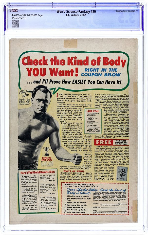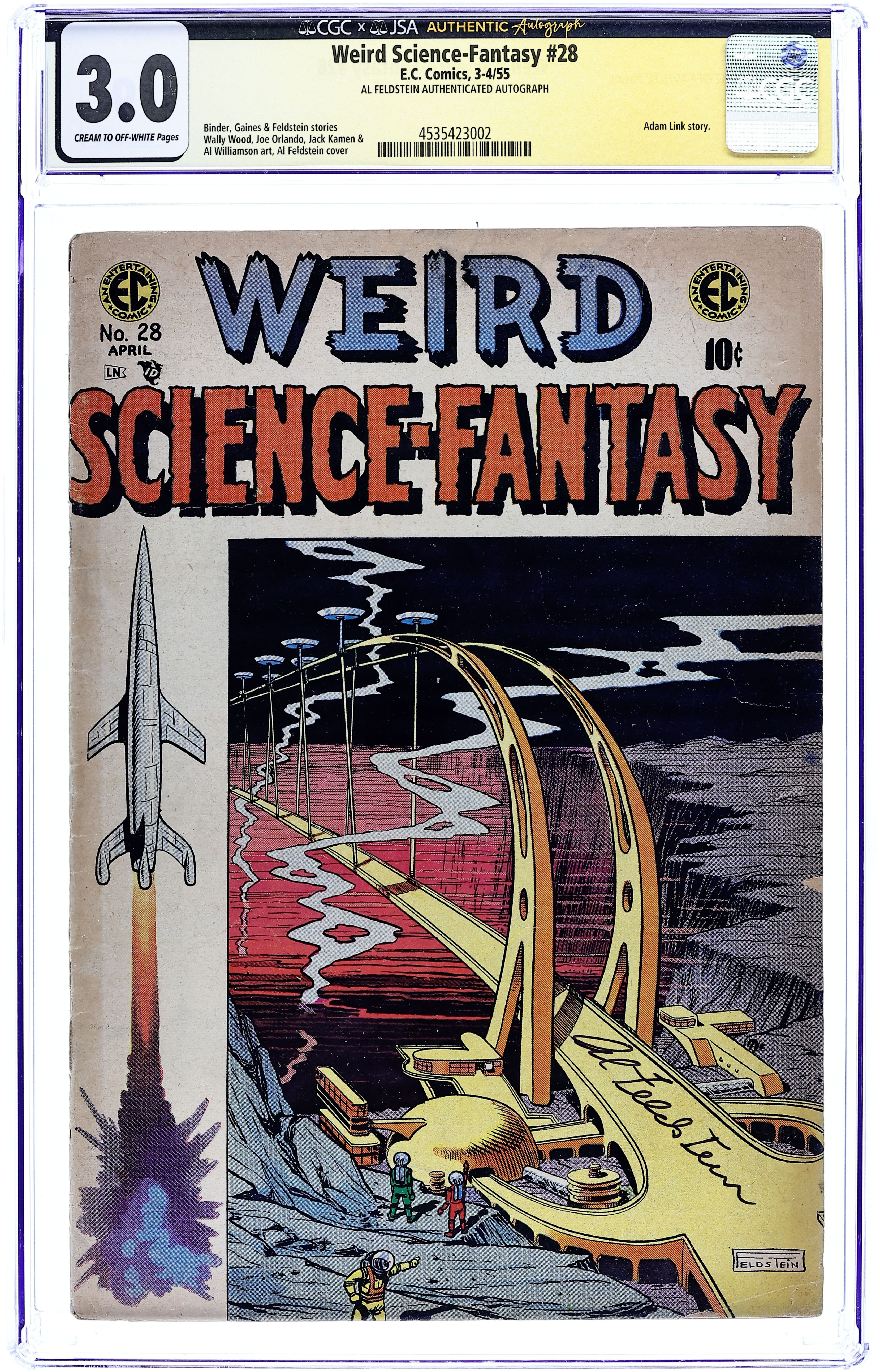 Cover art by Al Feldstein. Ad for Mad and Panic. "The Inferiors," script by Albert B. Feldstein, art by Wallace Wood; An expedition to find inhabited worlds finds nothing but destruction on planet after planet; The populations of all these worlds were of the same space-faring race, but the populations are now extinct, and the explorers don't know why; Then, they find an old recording that explains that the aliens had achieved their evolutionary peak and were now slowly devolving into violent beasts. "Lost In Space," script by Otto Binder, pencils by Al Williamson, inks by Al Williamson, Angelo Torres, and Roy Krenkel; Myra tells her father that she doesn't wish to remain on Mars any longer, but return to Earth to her Jim; One day, she makes the trip by herself...but Earth is not there! Ad for Piracy comic. "Round Trip," script by Bill Gaines (co-plot) and Al Feldstein (co-plot and script), art by Jack Kamen; All of his life, Henry was a dreamer, and his big dream was to be the Captain of a spaceship, or at least be able to travel into the depths of space. "The Trial of Adam Link," script by Albert B. Feldstein, art by Joe Orlando; Tom just inherited his uncle's estate, along with the robot, Adam Link; Despite the fact he is reasonable and polite, Adam continues to face persecution from humans; He even saves the lives of people trapped in a burning building, but nobody sees him do it; Finally, he is brought to "trial" to decide if he should be allowed to exist. 36 pages, full color. Cover price $0.10.