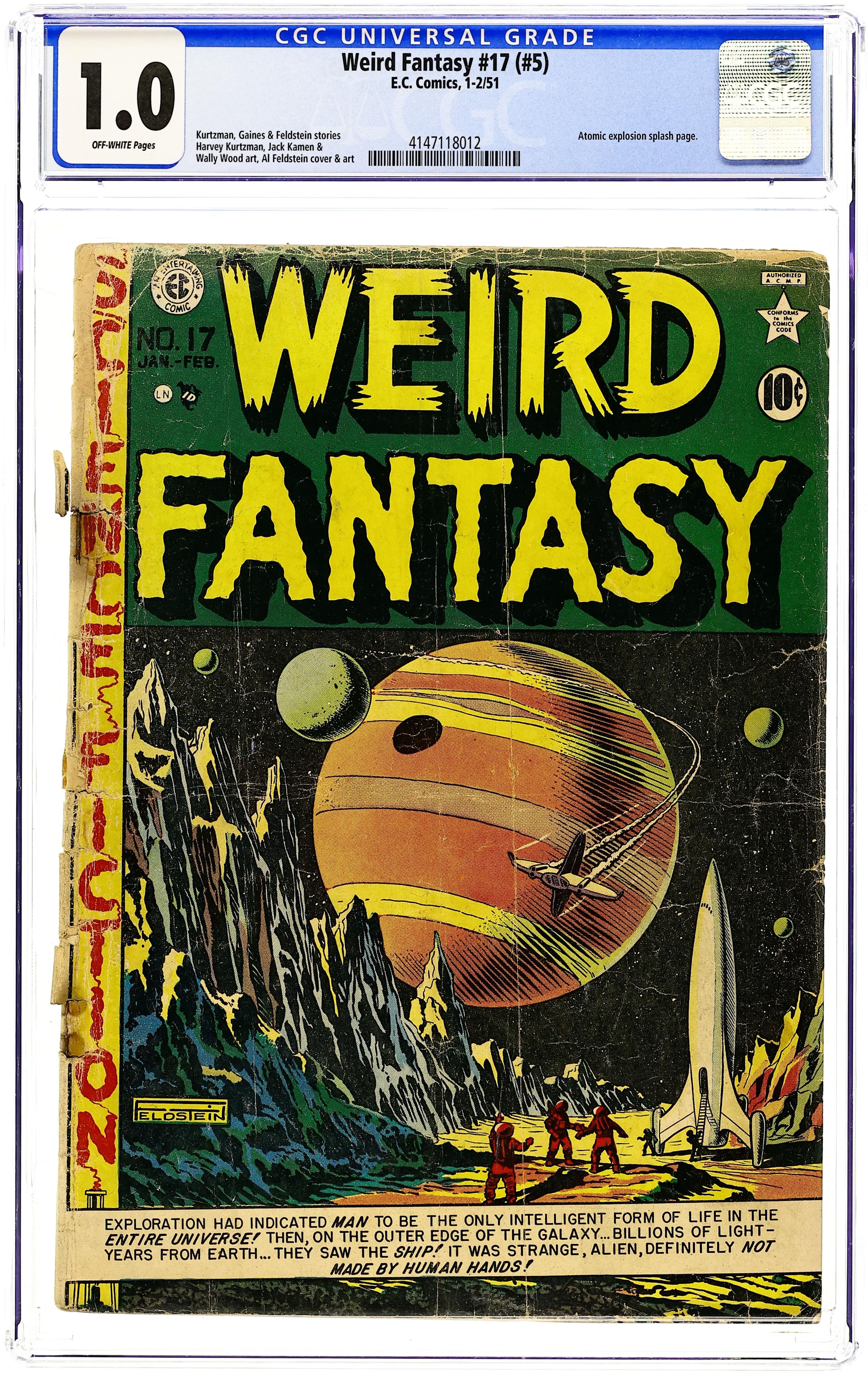 5th ISSUE in series (see note following) - Al Feldstein classic outer space cover. "Child of Tomorrow" (art by Feldstein), "The Time Machine and the Shmoe" (script and art by Harvey Kurtzman), "Deadlock" (art by Wally Wood as "Woody"), and "Prediction of Disaster" (art by Jack Kamen). NOTE: See 2nd Series for 1953 #17 Cover price $0.10.