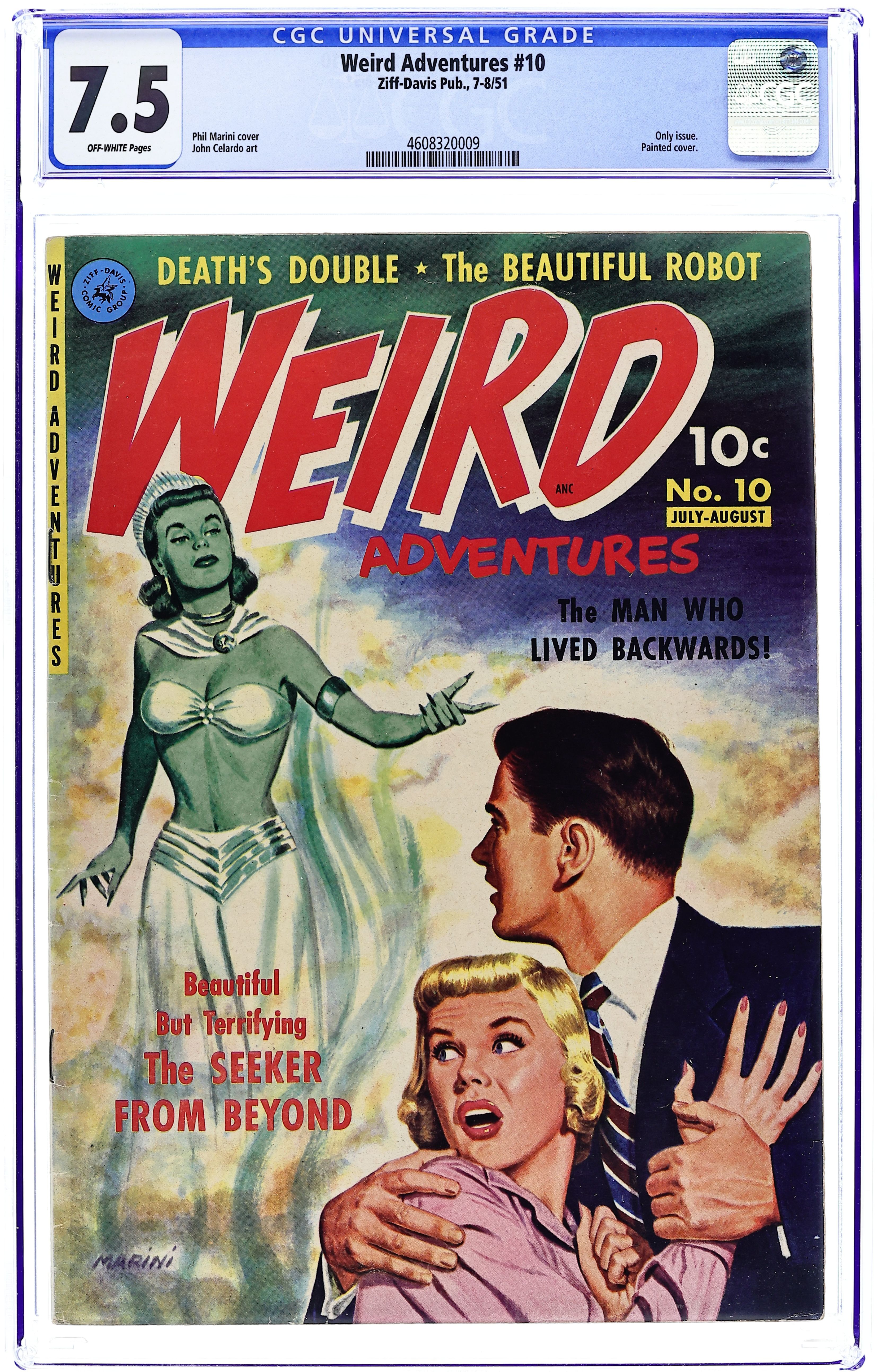Painted cover by Phil Marini. Stories and art by John Celardo and others. One-shot featuring Golden Age science fiction stories, like those in the pulp mags of publisher Ziff-Davis. Scientists create a dome over the city to aid against attack, but the plan backfires when criminals take control of the dome. A jilted scientist sets out to create a robot girlfriend and succeeds, but with an ironic twist. A man's life begins moving backwards from his wedding day. Plus predictions for futuristic devices, including mail-delivery drones, satellite TV, and self-refrigerating TV dinners. Painted cover by Phil Marini is like a sci-fi movie poster from the 1950s. Amazing Prophecies; Dome of Death; The Beautiful Robot; Horror of the Island; The Seeker from Beyond; The Man Who Lived Backwards! 32 pages, Full Color. Cover price $0.10.