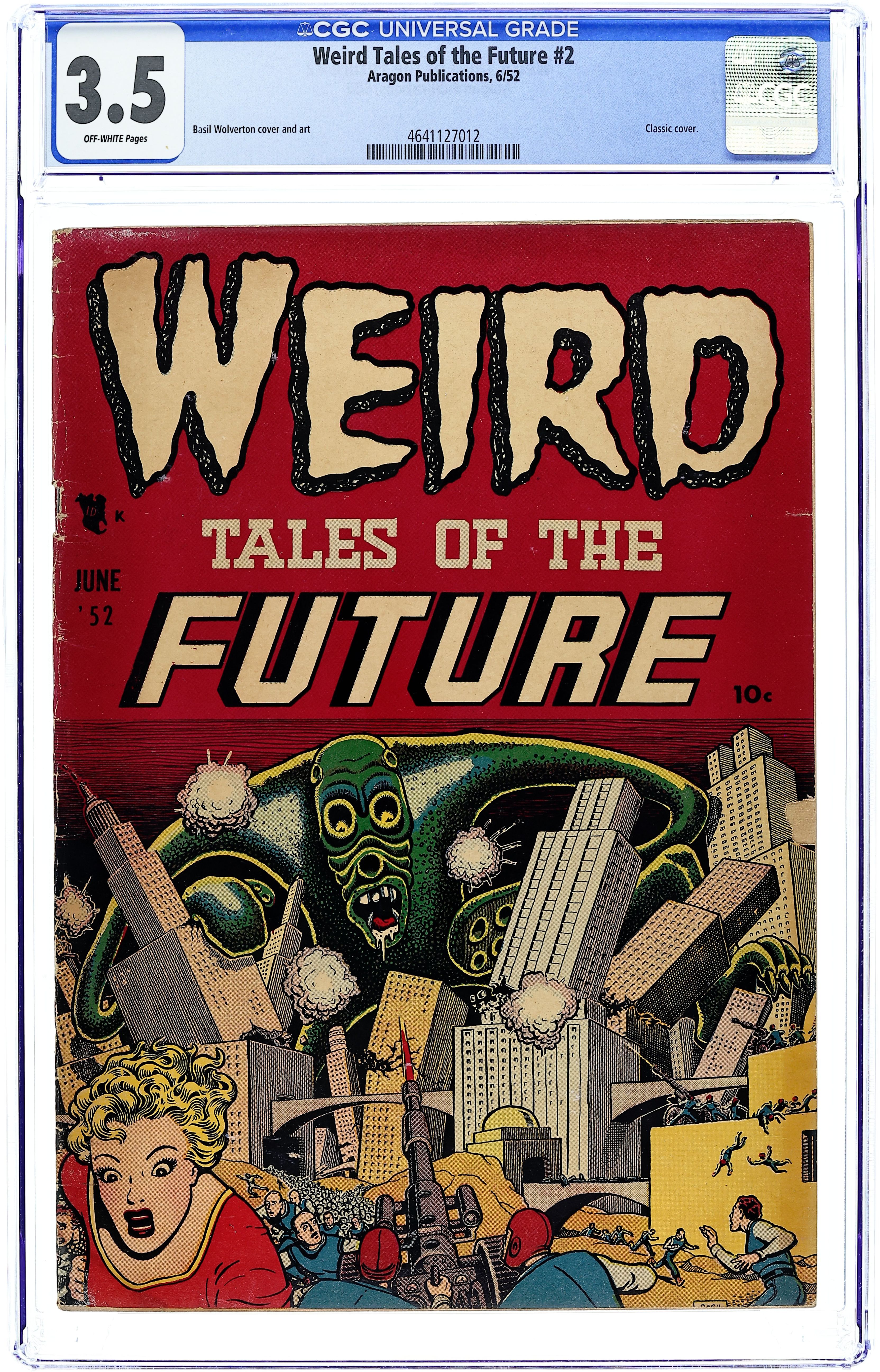 Cover by Basil Wolverton. Stories and art by Ed Smalle and Basil Wolverton. Pre-Code tales of science fiction and horror from Stanley Morse Publications. A killer volunteers to be placed in suspended animation for 20,000 years rather than be executed. A future criminal plots his escape from an intergalactic labor camp. Plus the first adventure of whimsical spacefaring hero Jumpin' Jupiter. Stories and a classic city-smashing monster cover by comics legend Basil Wolverton. The City of Primitive Man; Flight to the Future; Jumpin' Jupiter; Flying Saucers, Meteors, or What?; The Time Has Come; Escape to Death! 36 pages, Full Color. Cover price $0.10.