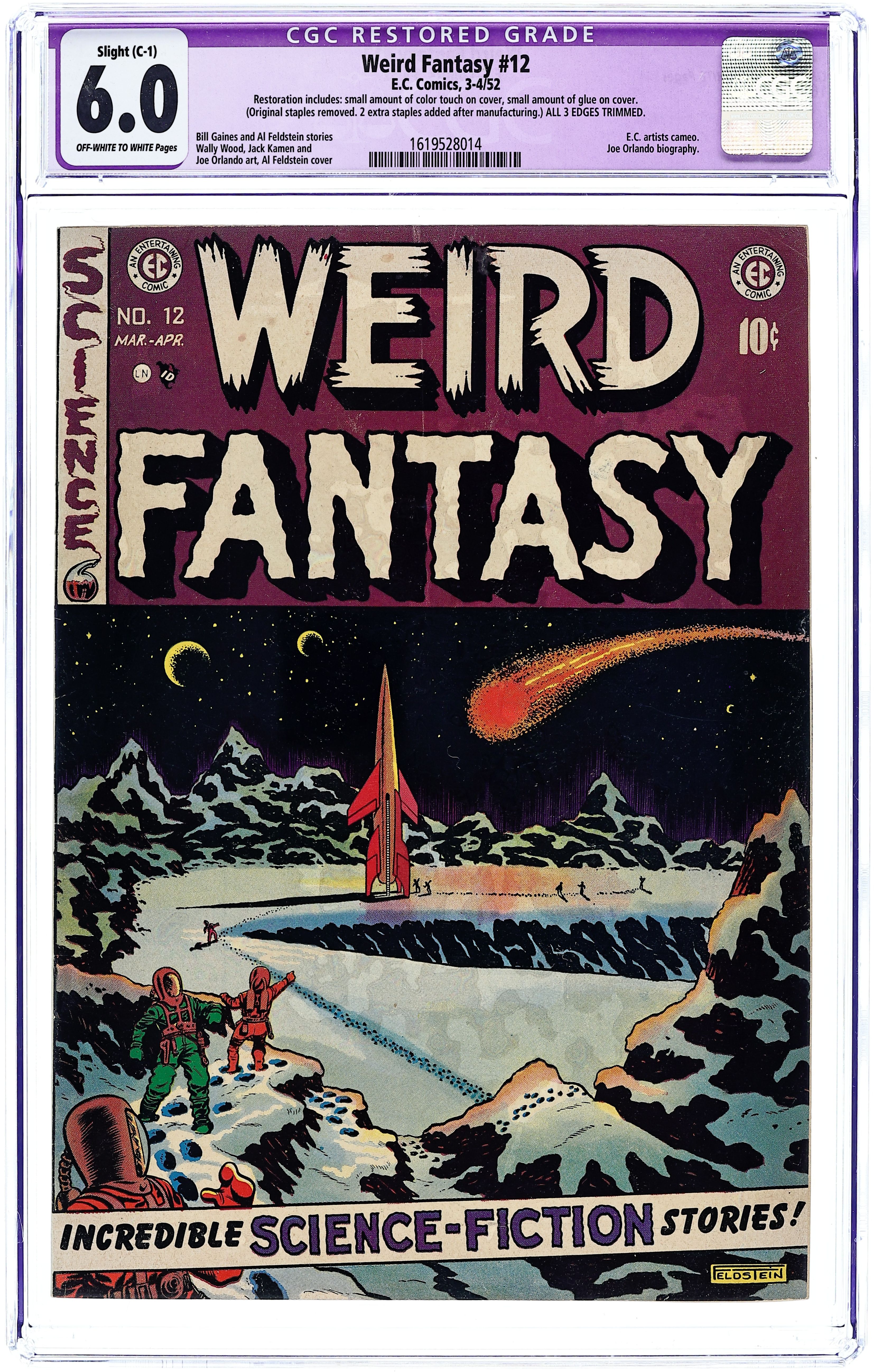 "The End" (art by Wally Wood), "The Trip" (art by Jack Kamen), "Home to Stay" (art by Wood; unauthorized swipe of two Ray Bradbury stories, "Kaleidoscope" and "Rocket Man"), and "Don't Count Your Chickens" (art by Joe Orlando). The letters page features a well-reasoned response from the editors to a letter from a parent critical of SF and horror comics such as those published by EC. Al Feldstein classic outer space cover. NOTE: See 1st Series for 1950 #13.
