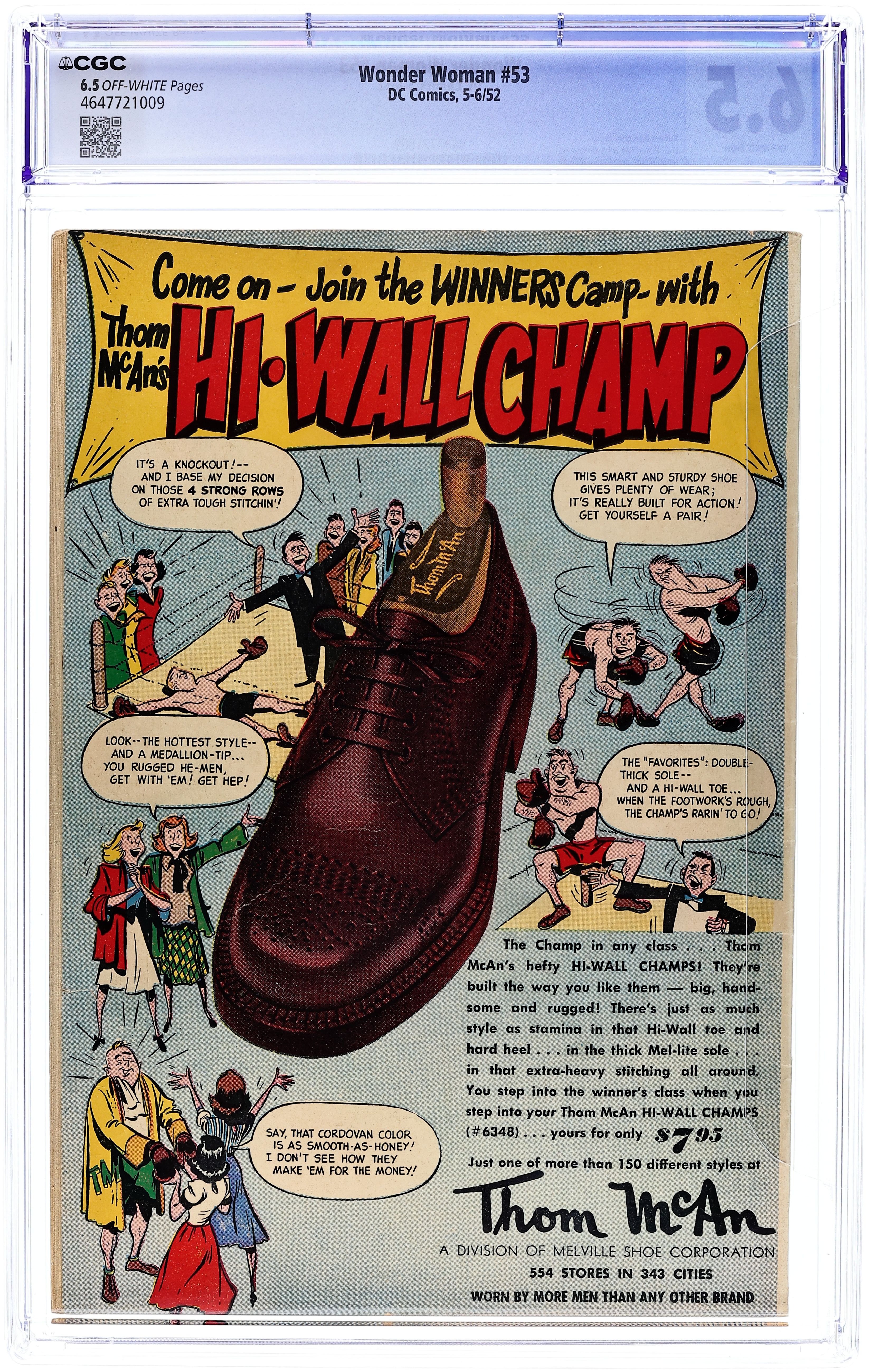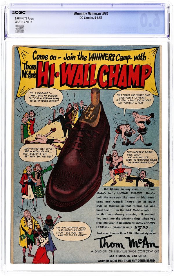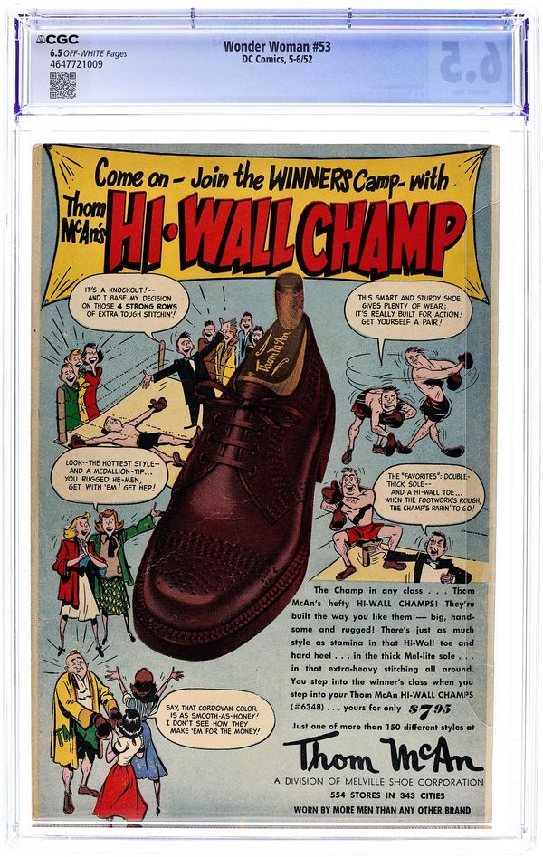 Cover by Harry G. Peter. "The Girl from Yesterday," script by Robert Kanigher, art by Harry G. Peter; Wonder Woman gets involved with a woman whose aunt has kept her living in the past. "Wonder Woman Captures the Moon," script by Robert Kanigher, art by Harry G. Peter. Wonder Women of History: three-page Hannah Moore bio by Julius Schwartz, pencils by Arthur F. Peddy, inks by Bernard Sachs. Two-page article, "Music Makers." "The Five Tasks of Thomas Tighe," script by Robert Kanigher, art by Harry G. Peter; Wonder Woman must help the Holliday Girls succeed at five tasks where men have failed in order to secure a million dollars for the Holliday College scholarship fund from a misogynist. One-page Tootsie Roll ad, "Captain Tootsie Saves the Day," art by C.C. Beck. 52 Pages, Full Color. Cover price $0.10.