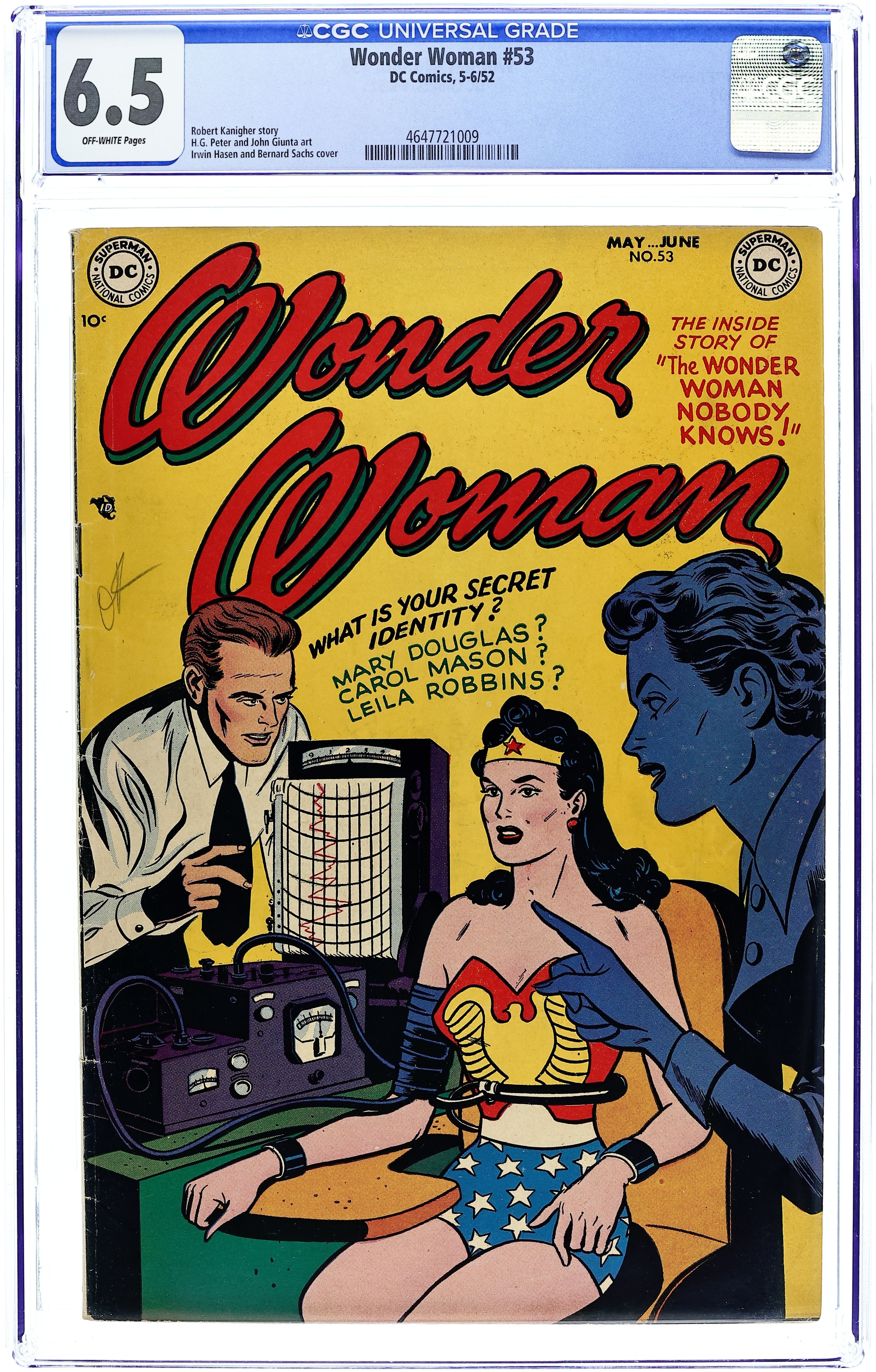 Cover pencils by Irwin Hasen, inks by Bernard Sachs. "Return of the Phantom Empire," script by Robert Kanigher, art by Harry G. Peter; Paradise Island finds itself at war with the land of Mu from 90 centuries ago! Jerry The Jitterbug humor page by Henry Boltinoff. "Little Miss Wonder Woman," script by Robert Kanigher, art by Harry G. Peter; Wonder Woman adopts a little girl who has lost her parents. Wonder Women of History: two-page Emilja Plater bio by Julius Schwartz, art by John Giunta. "Happy Landing" text story. "The Mystery of the Magic Typewriter," script by Robert Kanigher, art by Harry G. Peter Wonder Woman vs. leprechaun Moon O'Day; story used in Fredric Wertham's "Seduction of the Innocent." 52 Pages, Full Color. Cover price $0.10.