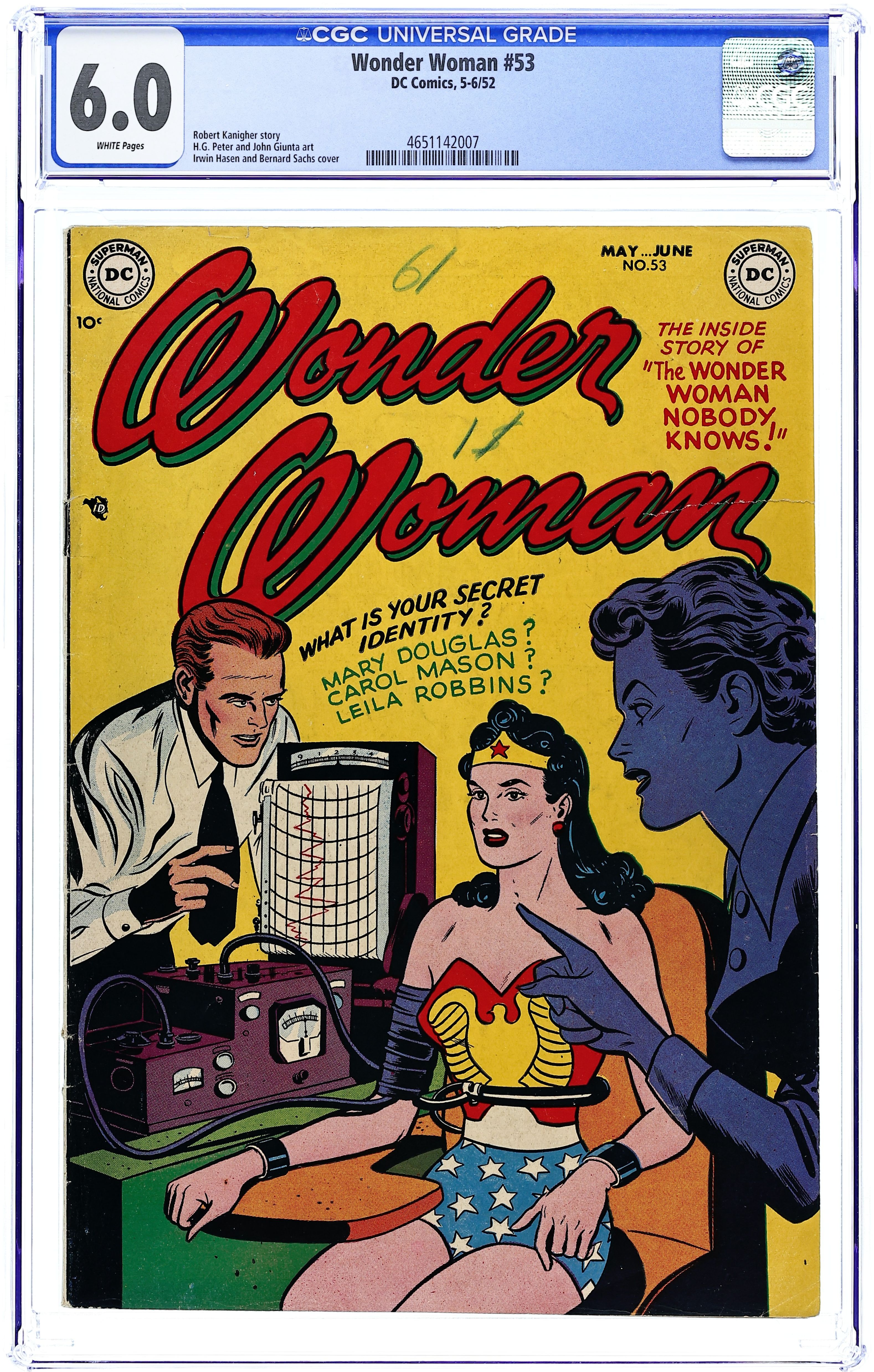 Cover pencils by Irwin Hasen, inks by Bernard Sachs. "The Amazing Impersonation!", script by Robert Kanigher, art by Harry G. Peter; The Daily Globe runs a contest to discover Wonder Woman's secret identity and discovers she is Jane Case, a librarian. "Wonder Woman's Strange Substitute!", script by Robert Kanigher, art by Harry G. Peter; Luria wins an atheletic contest on Paradise Island and demands the right to go to Man's World and fight crime like Wonder Woman, even though it means she will forfeit her immortality. Wonder Women of History: two-page Caroline Herschel bio by Julius Schwartz. "Let's Dance" text article by M. Sarafianos. Peg humor page by Henry Boltinoff. Superboy stars in a one-page public service announcement, "Share With Others!", script by Jack Schiff, art by Win Mortimer. 44 Pages, Full Color. Cover price $0.10.