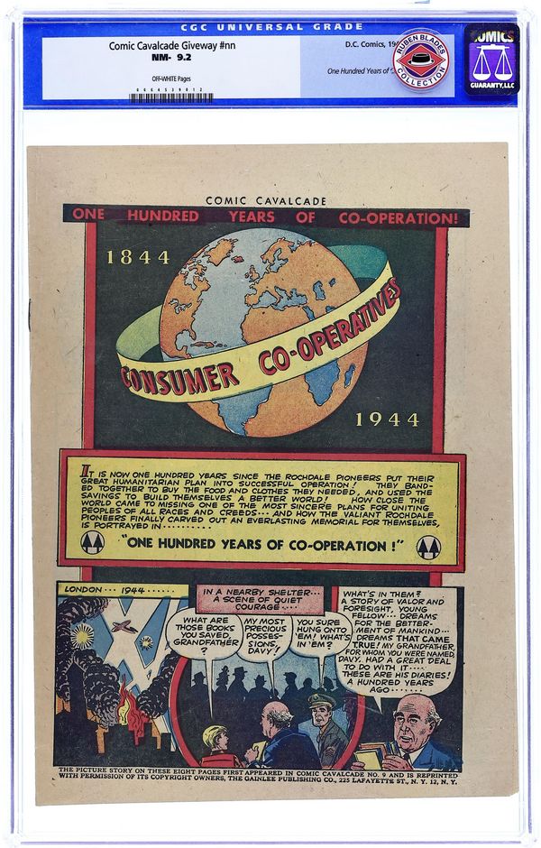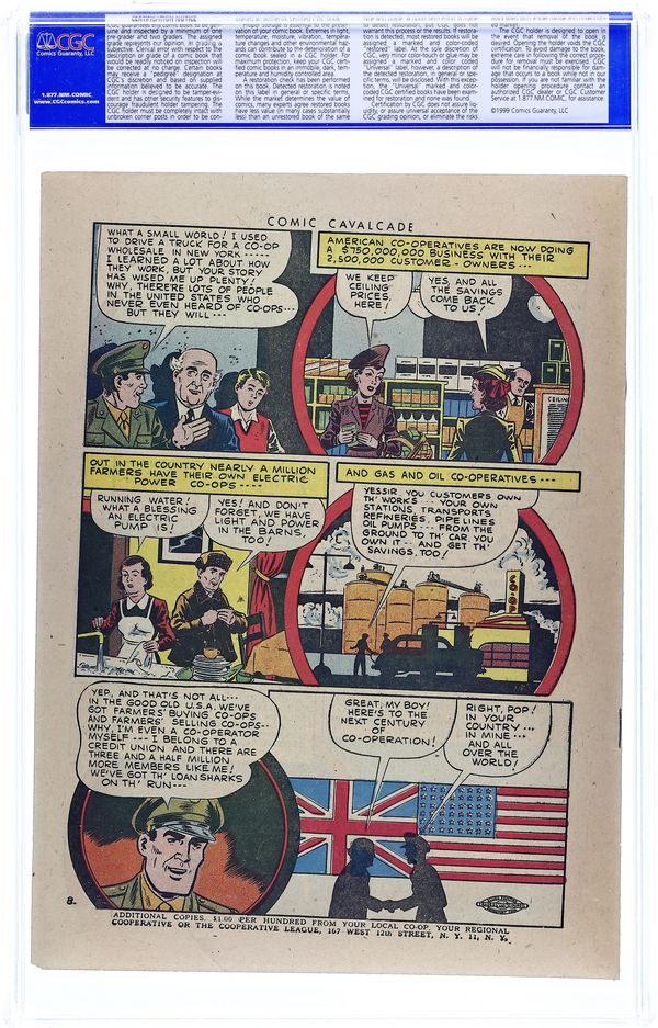 Comic Cavalcade: One-Hundred Years of Cooperation (1945) is an 8-page, full color, newsprint promotional comic (reprinted from Comic Cavalcade #9). No cover price.