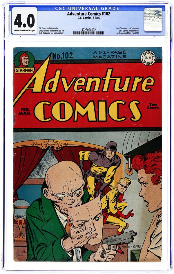 Cover pencils by Jack Kirby, inks by Joe Simon. The Man Who Couldn't Sleep, script and pencils by Jack Kirby; The Sandman is able to assist a new criminal who suffers from the lack of sleep and has taken up crime only because he hasn't had a wink of sleep in 40 years, and needs something to occupy the long nights! The Time-Machine Crime starring Starman, pencils by Jack Burnley and Mort Meskin (page 10 panels 3-7, page 11), inks by Jack Burnley and George Roussos (page 10 panels 3-7, page 11). Adventure of the Desperate Dragons starring The Shining Knight, art by Louis Cazeneuve. The Enigma of the Absent-Minded Artists starring Genius Jones, script by Alfred Bester, art by Stan Kaye. Man Trap Island starring Manhunter, script and pencils by Jack Kirby. The Case of the Sponsored Crooks starring Hourman and Thorndyke, art by Bernard Baily. 68 Pages, Full Color. Cover price $0.10.
