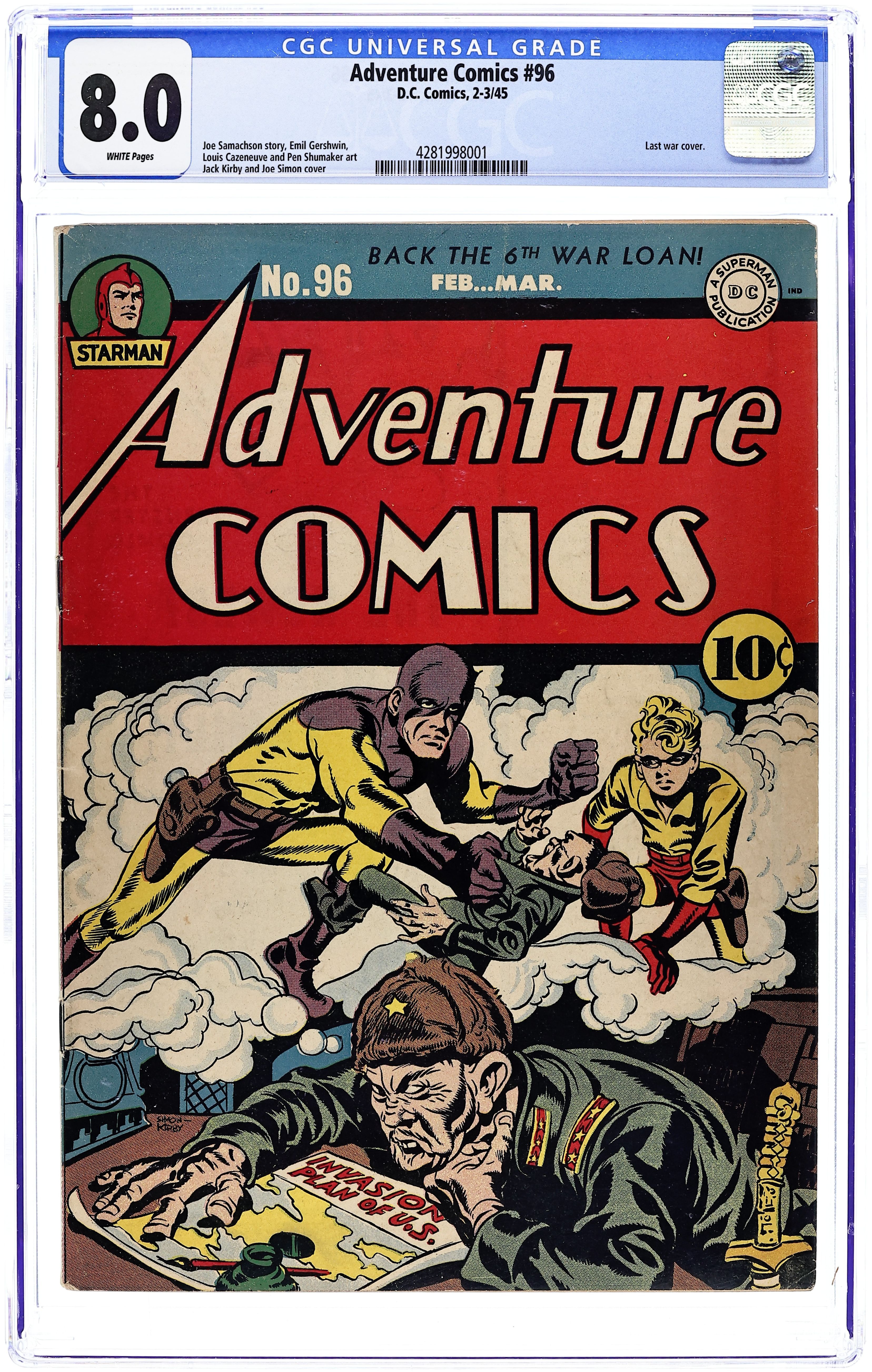 Cover pencils by Jack Kirby, inks by Joe Simon. Sleep For Sale starring The Sandman, script by Joe Samachson, art by Pen Shumaker; Mr. Kendall goes to the Sleepatorium, a special dormitory that puts people to sleep when nothing else works. What he doesn't know, and that the Sandman discovers, is that a fellow patient, a criminal known as Wide-Awake Willie, also uses the facility as a blind to get sleep. Roguery in Nine Reels starring The Shining Knight, script by Joe Samachson, art by Louis Cazeneuve. Gifts from the Stars starring Starman, script by Joe Samachson, art by Emil Gershwin. Genius Jones Broadcasting, script by Whitney Ellsworth, art by Stan Kaye. The Peerless Puppets starring Mike Gibbs, Guerilla, script by Joe Samachson, art by Edmond Good. 52 pages, Full Color. Cover price $0.10.