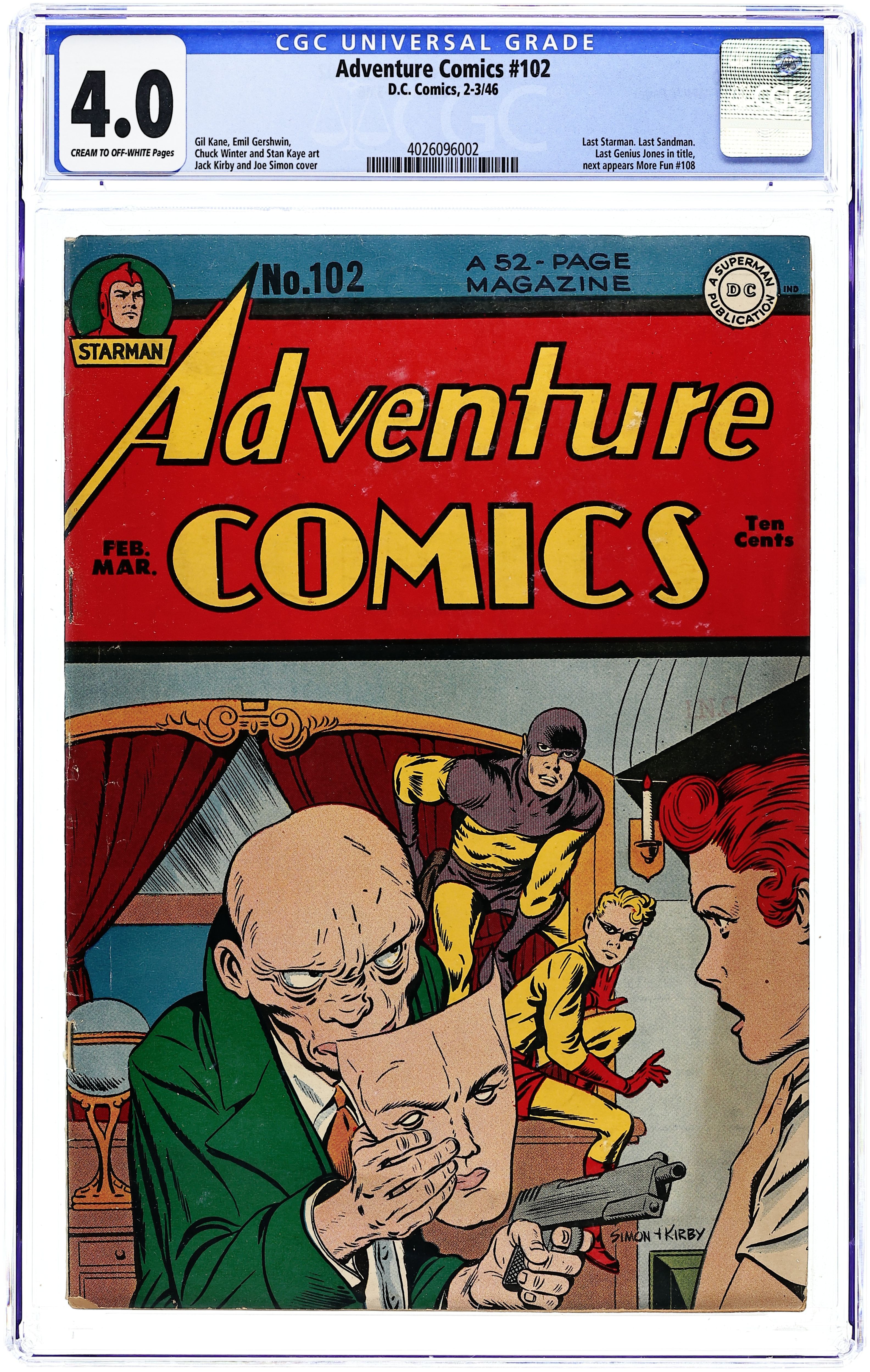 Cover art by Jack Burnley. Case of the Magic Bloodstone, script by Gardner F. Fox, pencils by Jack Burnley, inks by Jack Burnley and Ray Burnley [backgrounds]; Starman becomes involved in a case involving the mysterious deaths of several members of an expedition in the Arabian Desert who had taken an accursed bloodstone from an ancient temple. The Adventure of the Stolen Armor starring The Shining Knight, art by Creig Flessel. The Bullet-Proof Tigers starring Steve Conrad, Adventurer, script and art by Jack Lehti. Dr. Glisten starring The Hourman, script by Ken Fitch, art by Bernard Baily. The Fish-Men starring Paul Kirk, Manhunter, script and art by Ed Moore. The Riddle of the Slave Market starring The Sandman, script by Jack Kirby, pencils by Jack Kirby. 68 Pages, Full Color. Cover price $0.10.