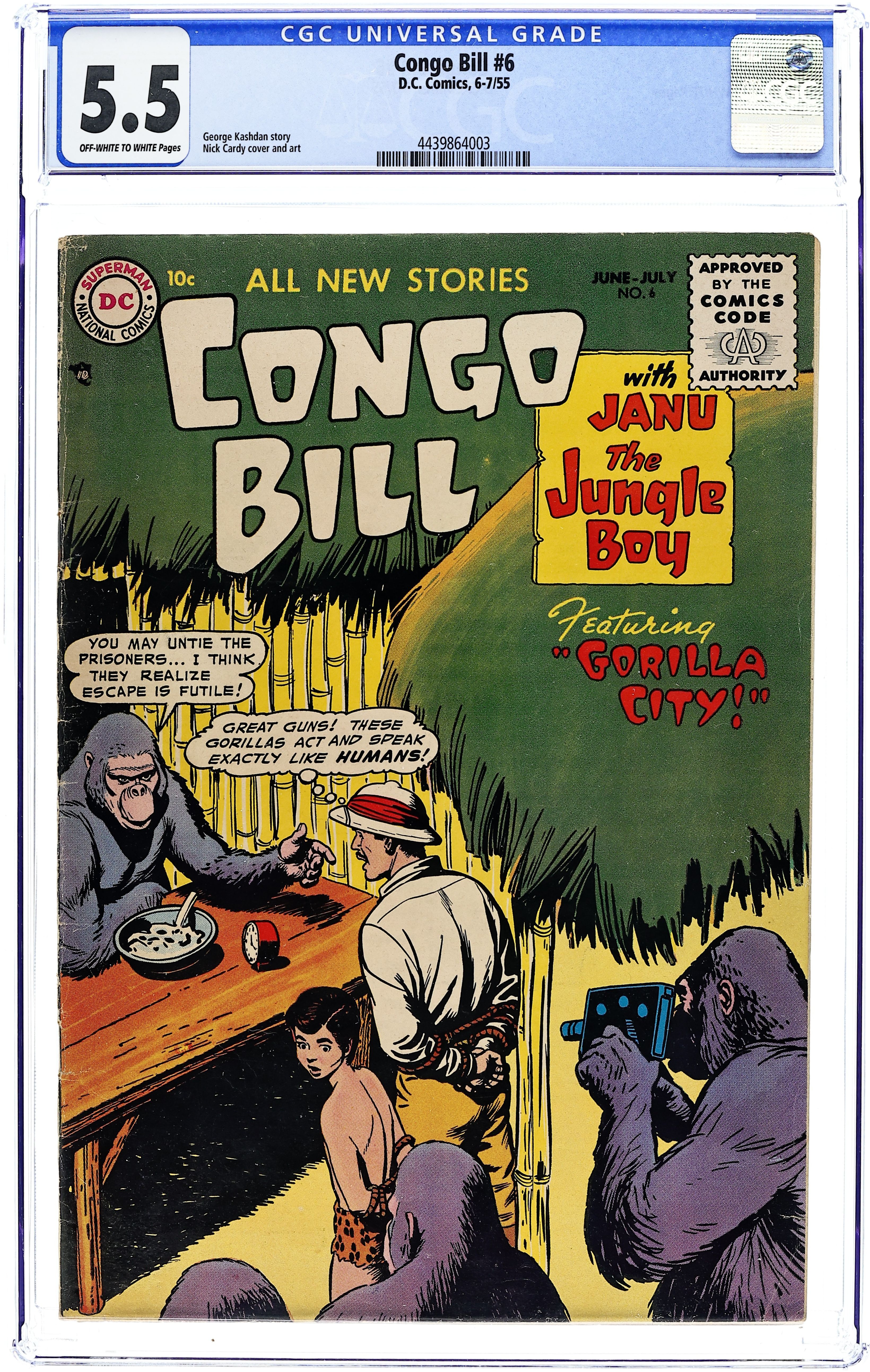"Gorilla City!" Congo Bill and Janu encounter a village filled with talking gorillas who are actually Martians. "Bombo?the Rage of London!" Bombo the Rogue Elephant goes to London. Also includes: "The Jungle Trolley Car!; "The World's Greatest Hunters"; and "Unseen Dangers of the Jungle." Cover by Nick Cardy. Cover price $0.10.
