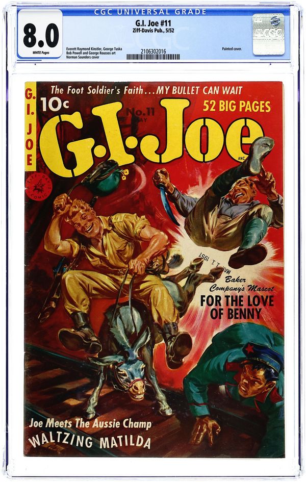 2 #11s exist. See previous Ziff Davis Series (1950-51). Painted cover art by Norman Saunders. For the Love of Benny starring G.I. Joe; An army contains all kinds of men. One was Long John Silver, who lounged all day in his long red woolen underwear. Yousouff the Terrible Turk starring G.I. Joe, art by George Tuska; Joe and Sgt. Mulvaney meet a big Turkish wrestler in a new U.N. brigade in Korea. Waltzing Mathilda starring G.I. Joe, art by Bob Powell. Damon and Pythias starring Buddies, art by George Roussos; The two pals fight over the same girl. Medwick the Medic starring G.I. Joe, art by George Olesen. My Bullet Can Wait starring G.I. Joe, art by Alex Kotzky. 52 pgs. $0.10. Cover price $0.10.
