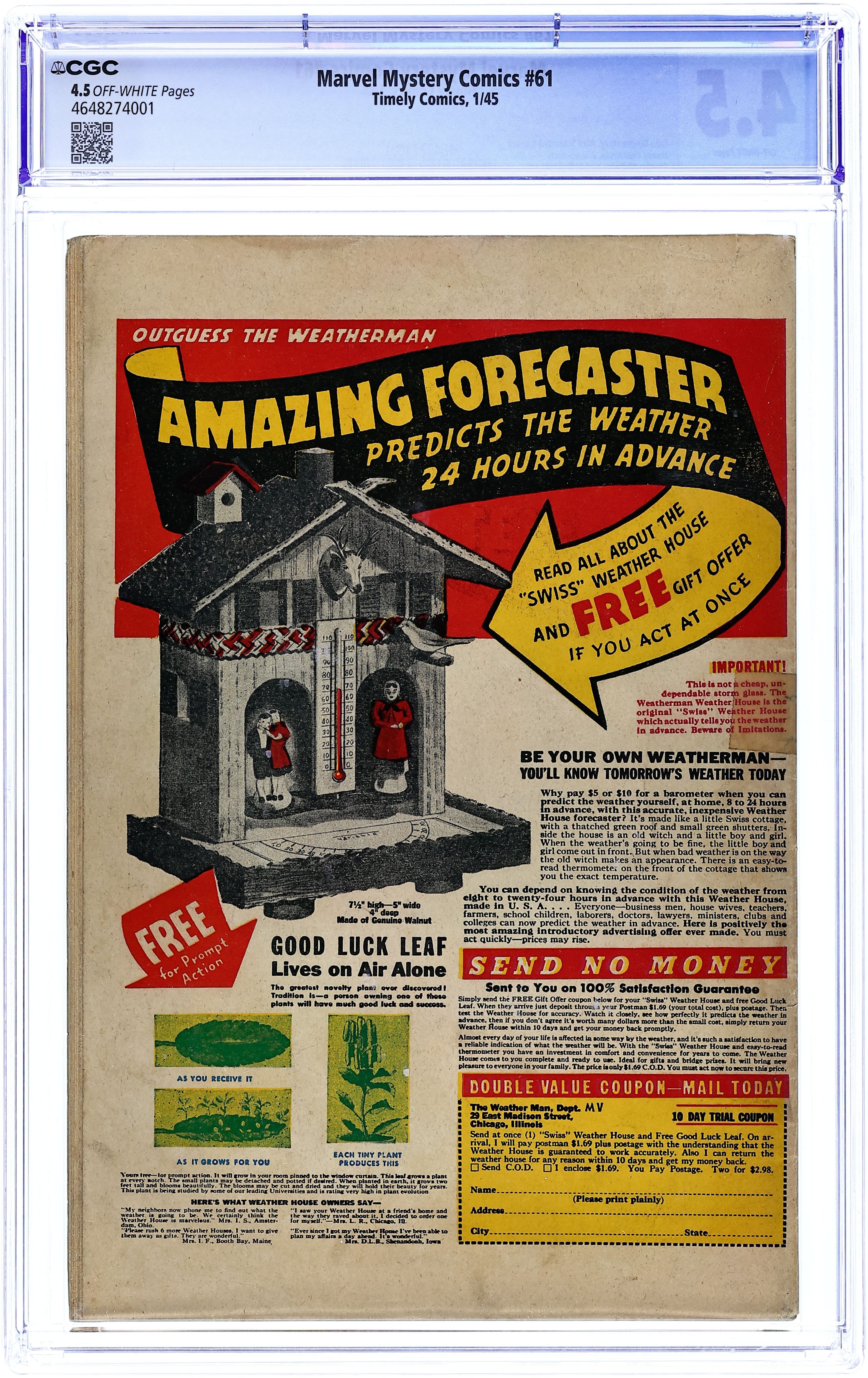 Master of Murder starring Human Torch, pencils by Mike Sekowsky. The Last Atoll starring Sub-Mariner, art by Ken Bald. Mad Music Moans a Devil's Dirge starring Blonde Phantom, pencils by Mike Sekowsky. Boy Who Couldn't Study starring Captain America, art by Syd Shores. 52 pages Cover price $0.10.