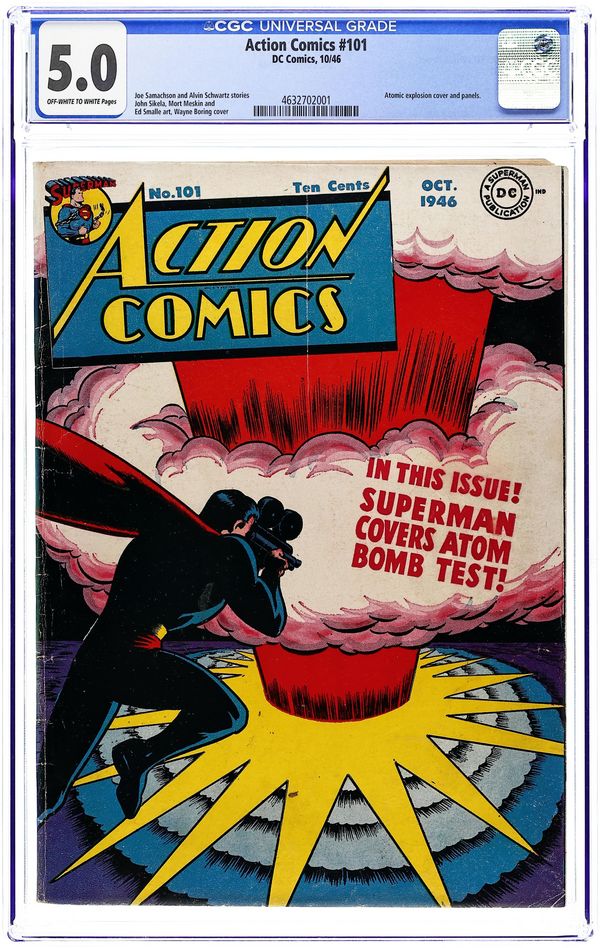 Nuclear explosion cover by Wayne Boring and Stan Kaye. Crime Paradise starring Superman, pencils by Win Mortimer, inks by George Roussos. Devilfish's Domain starring Congo Bill, script by Alvin Schwartz, art by Ed Smalle. The Perfect Hideaway starring Hayfoot Henry, script by Alvin Schwartz, art by Stan Kaye. When East Goes West starring Vigilante, script by Joe Samachson, inks by George Roussos. The Man Who Didn't Dare starring Zatara, art by W. F. White. 52 Pages, Full Color. $.10 Cover price $0.10.